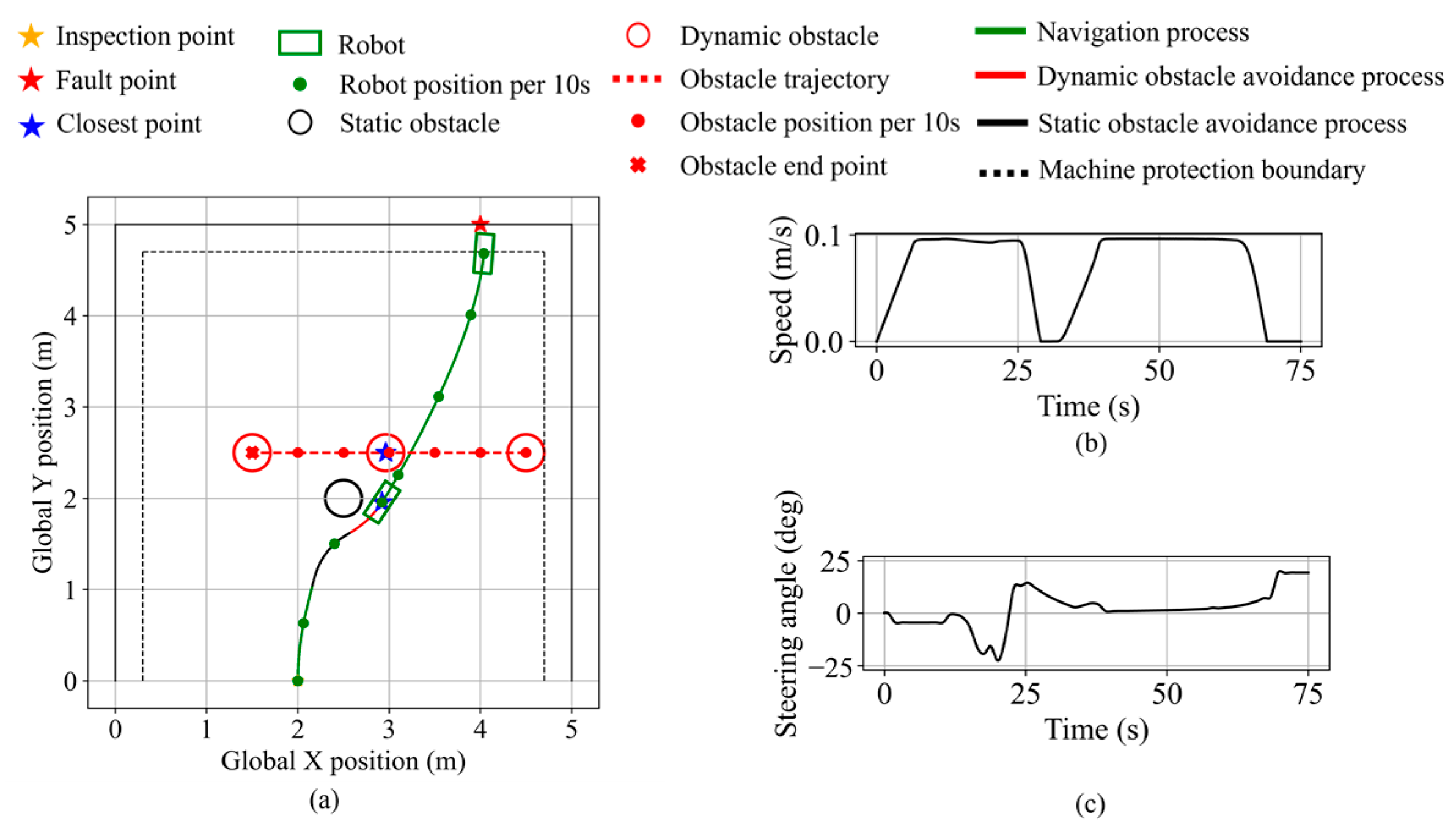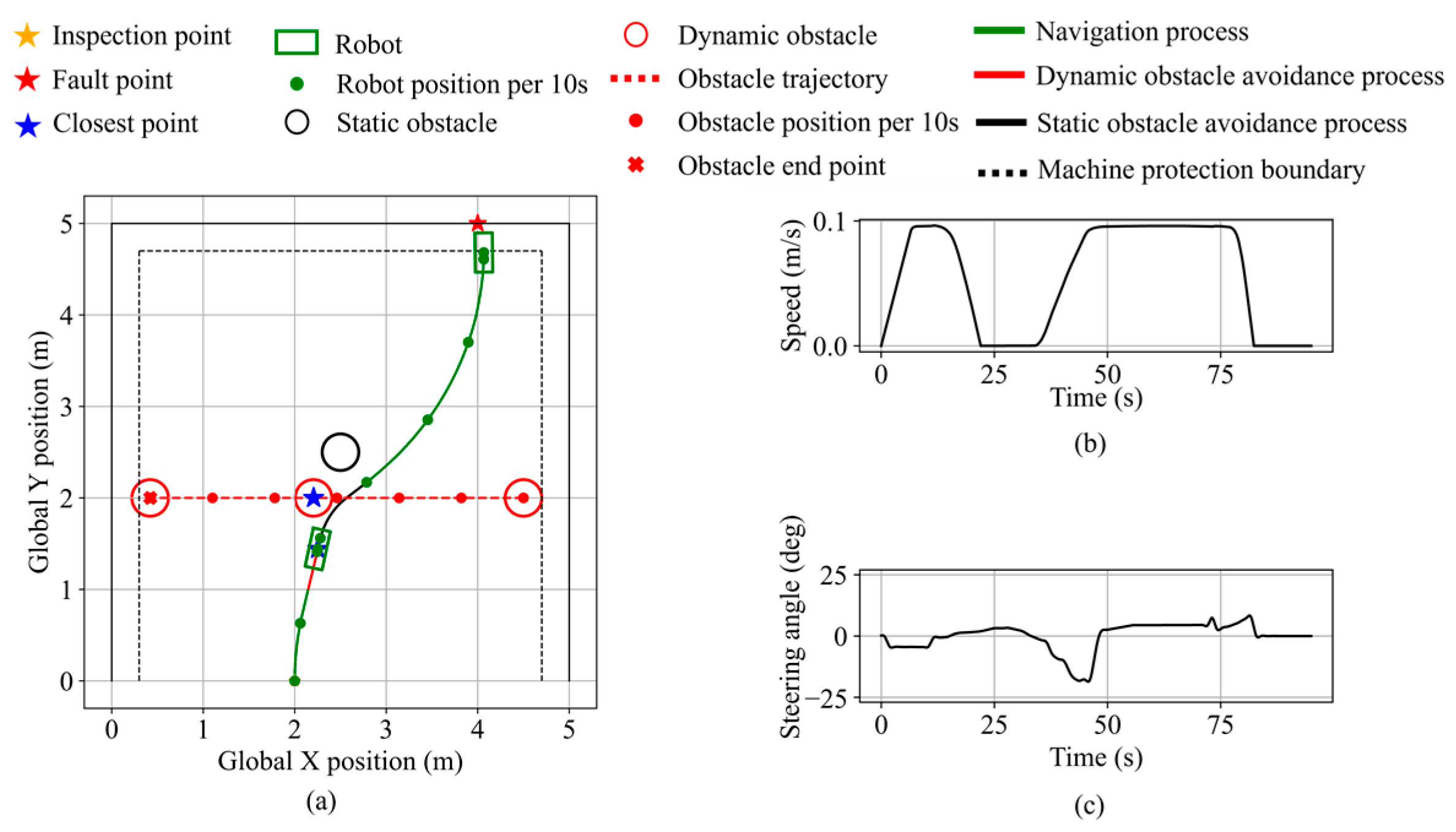Robot states during dynamic obstacle avoidance in validation scenario 5. (a) Robot and dynamic obstacle trajectory. (b) Robot speed. (c) Robot steering angle.
