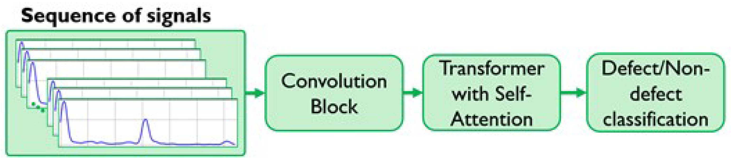 - Sendra, T.; Belanger, P. On the use of a Transformer Neural Network to deconvolve ultrasonic signals. Ultrasonics 2025, 152, 107639. [Google Scholar] [CrossRef] [PubMed]