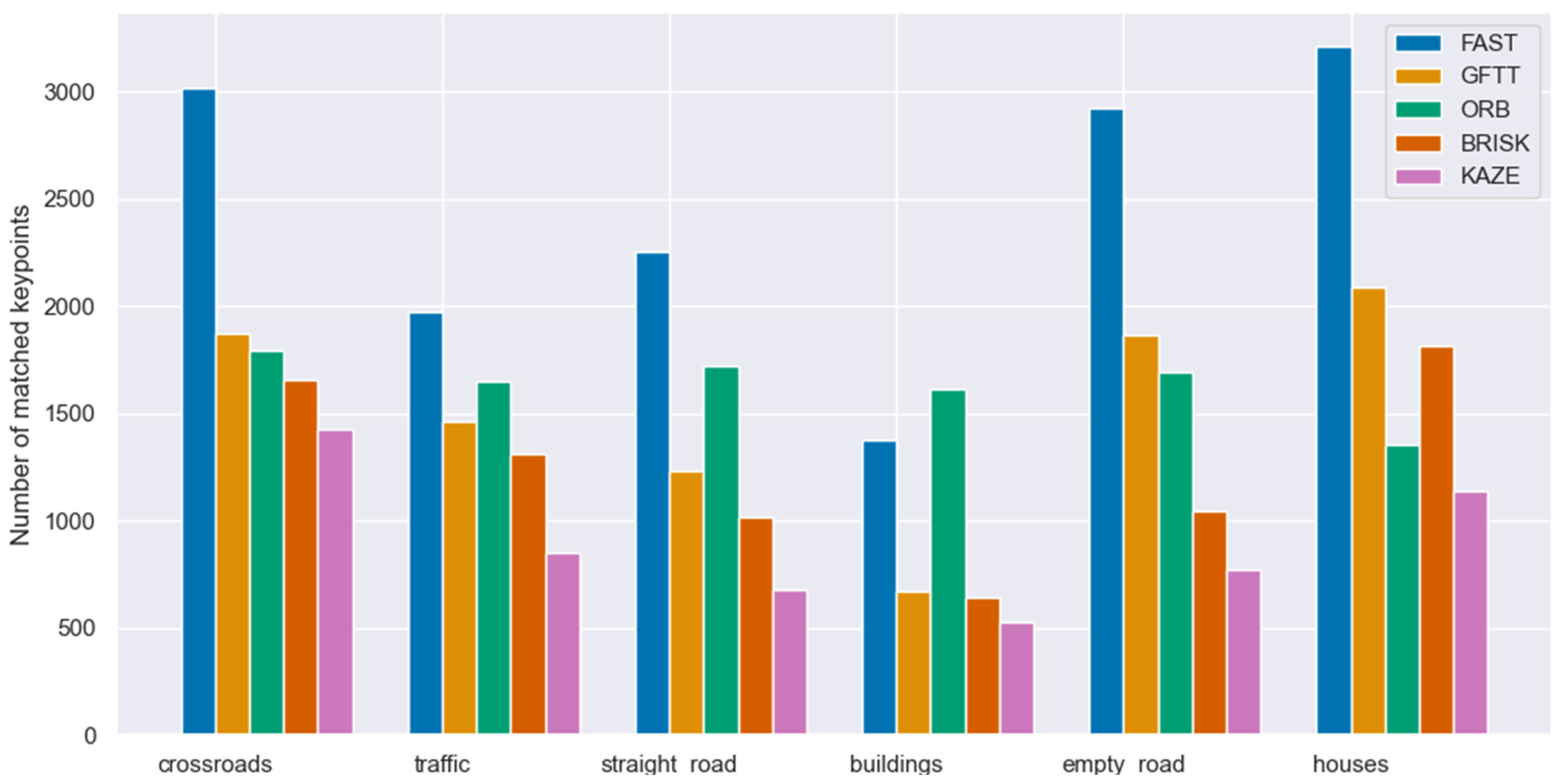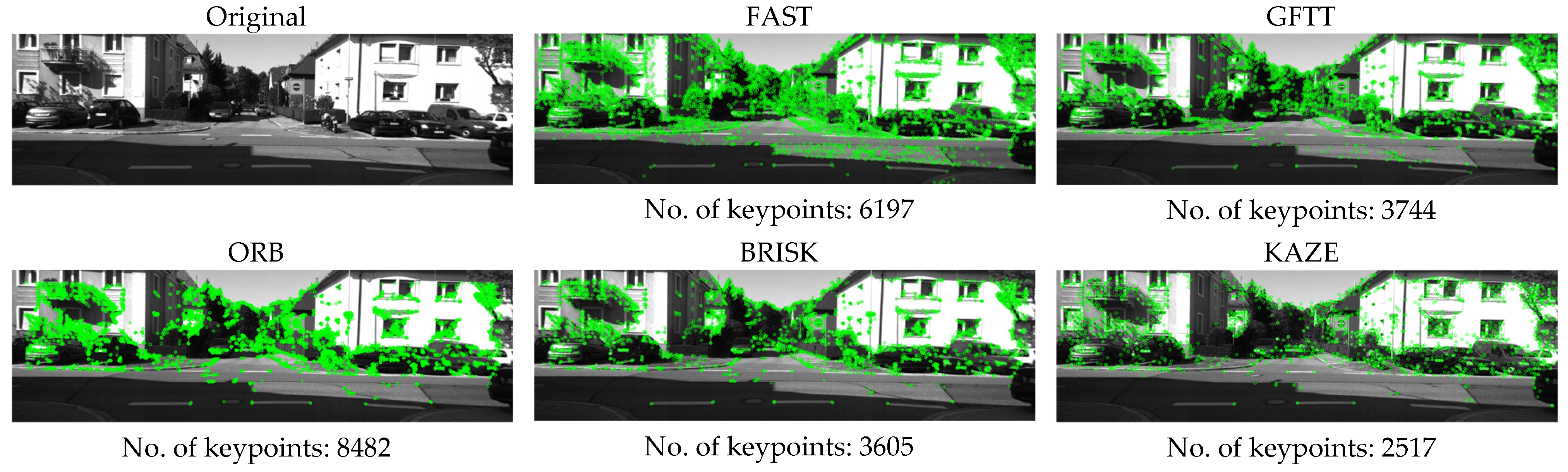 Figure 2 shows an example of examining the number of keypoints detected for the left image in the intersection scene, along with the visualization of points for each method. The results of the conducted study of the number of keypoints detected for selected methods and scenes are summarized in