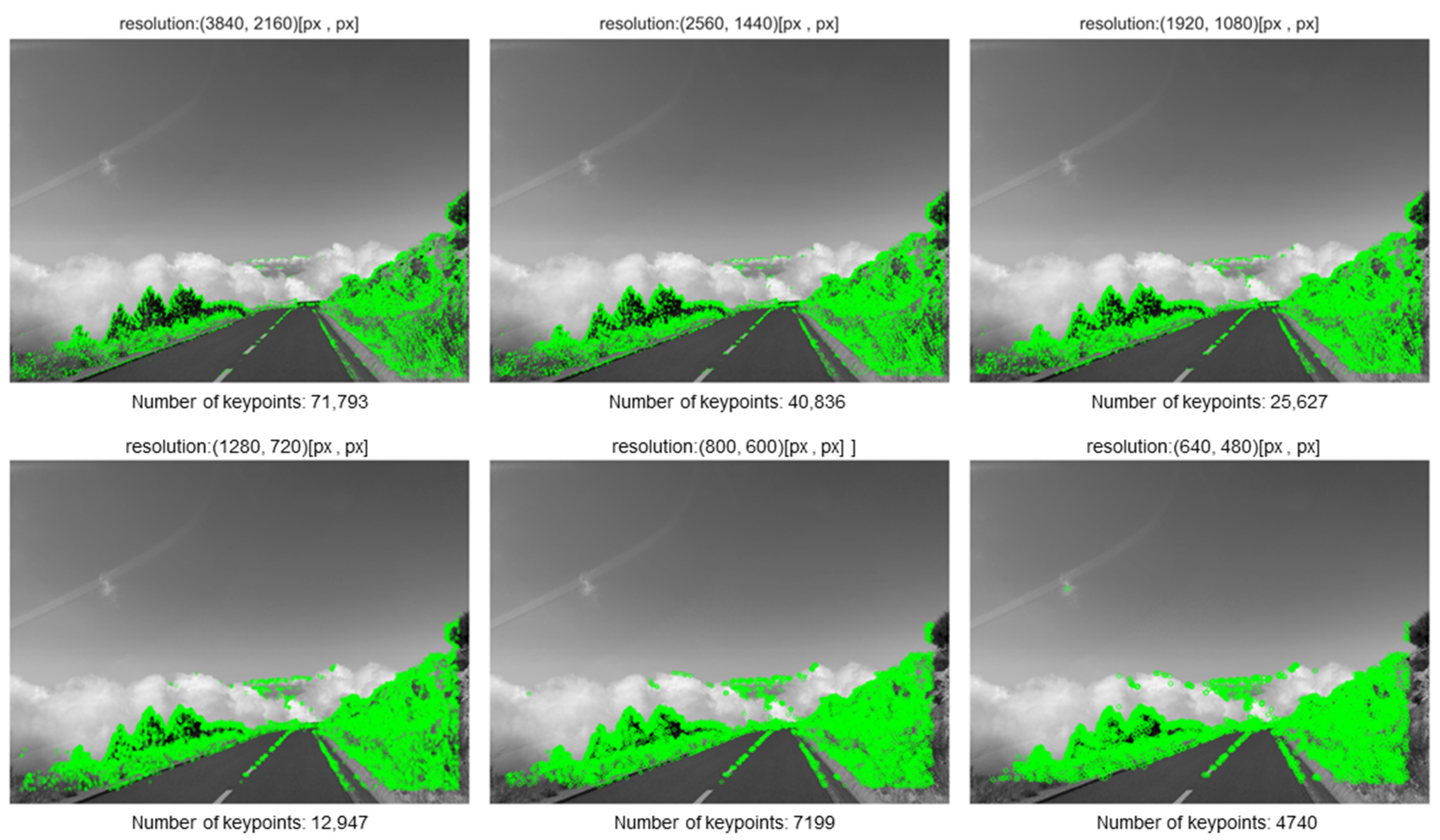It is worth noting, however, that in the lowest-resolution images, additional keypoints emerge that are not present in higher-resolution versions. The appearance of these points is likely attributable to artifacts introduced during the image downsampling process, which can alter local texture and gradient characteristics, thereby influencing the behavior of feature detection algorithms. This effect is not strictly correlated with the sampling density of low-resolution images but may arise from the specific interpolation or resampling techniques applied during preprocessing.