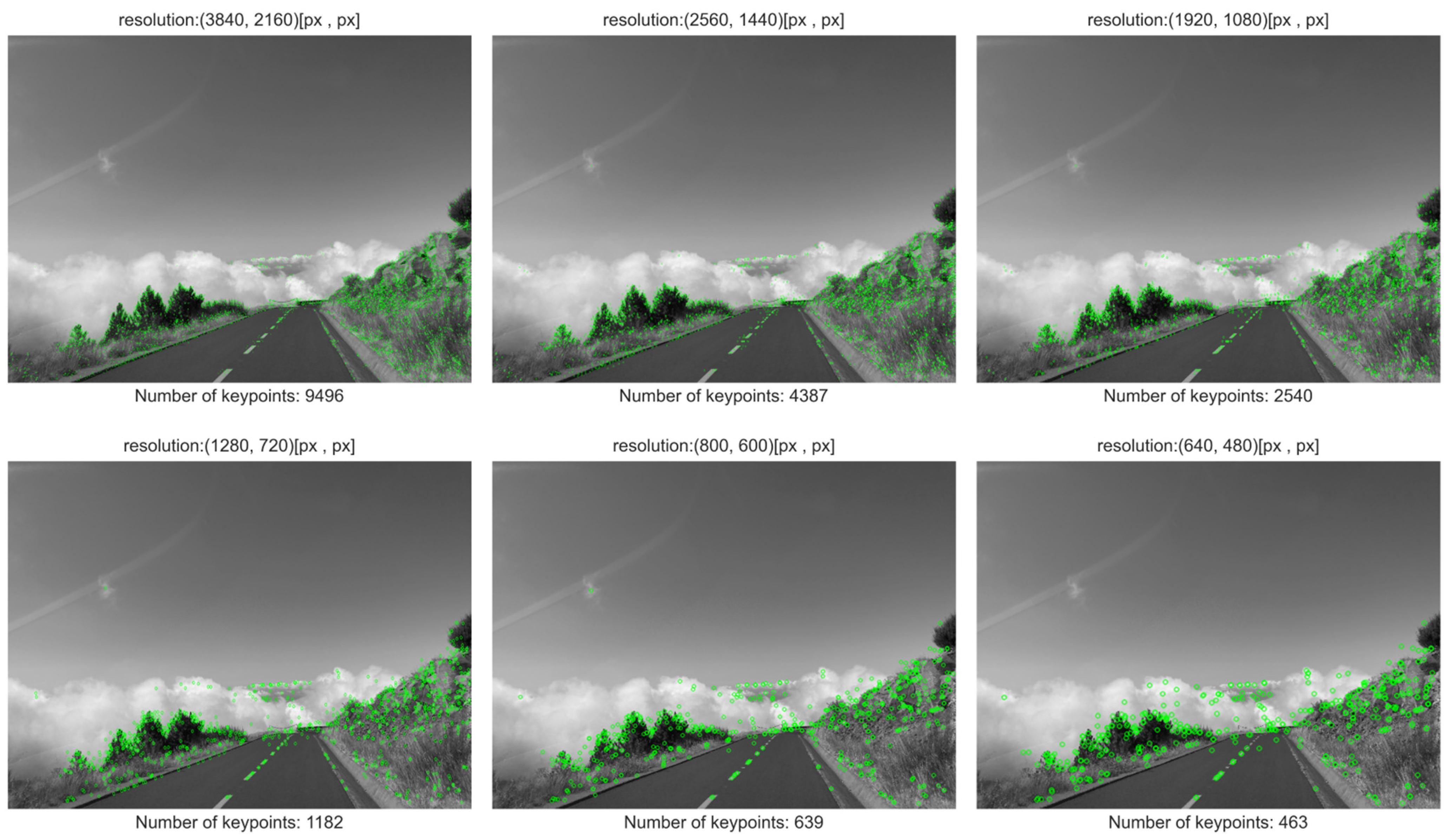 Aggregate results of the study on the impact of image resolution on the number of detected keypoints are presented in