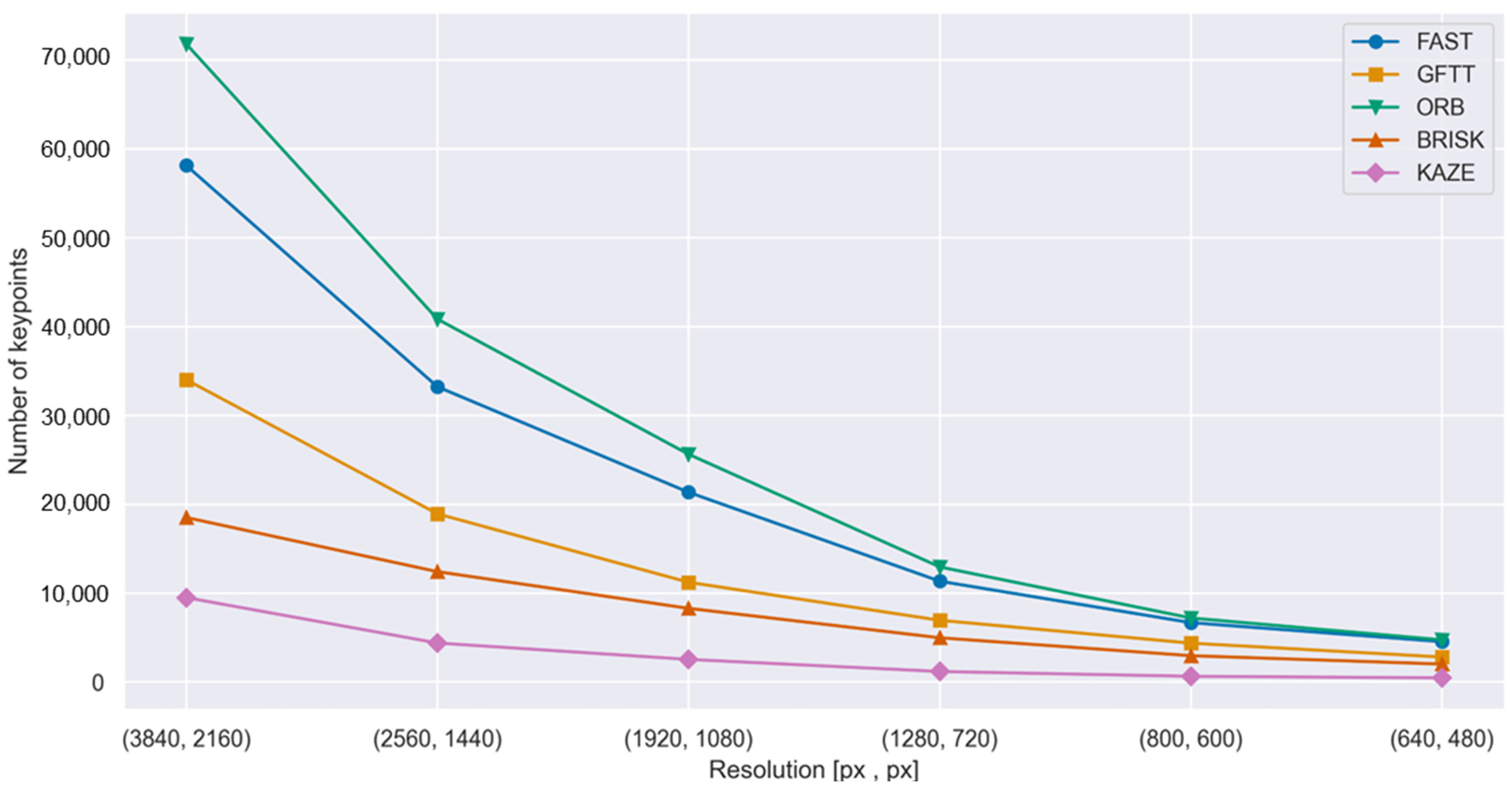 Table 4. As illustrated in the graph, the observed trend is consistent across all evaluated feature detection methods: reducing image resolution leads to a decrease in the number of detected keypoints.