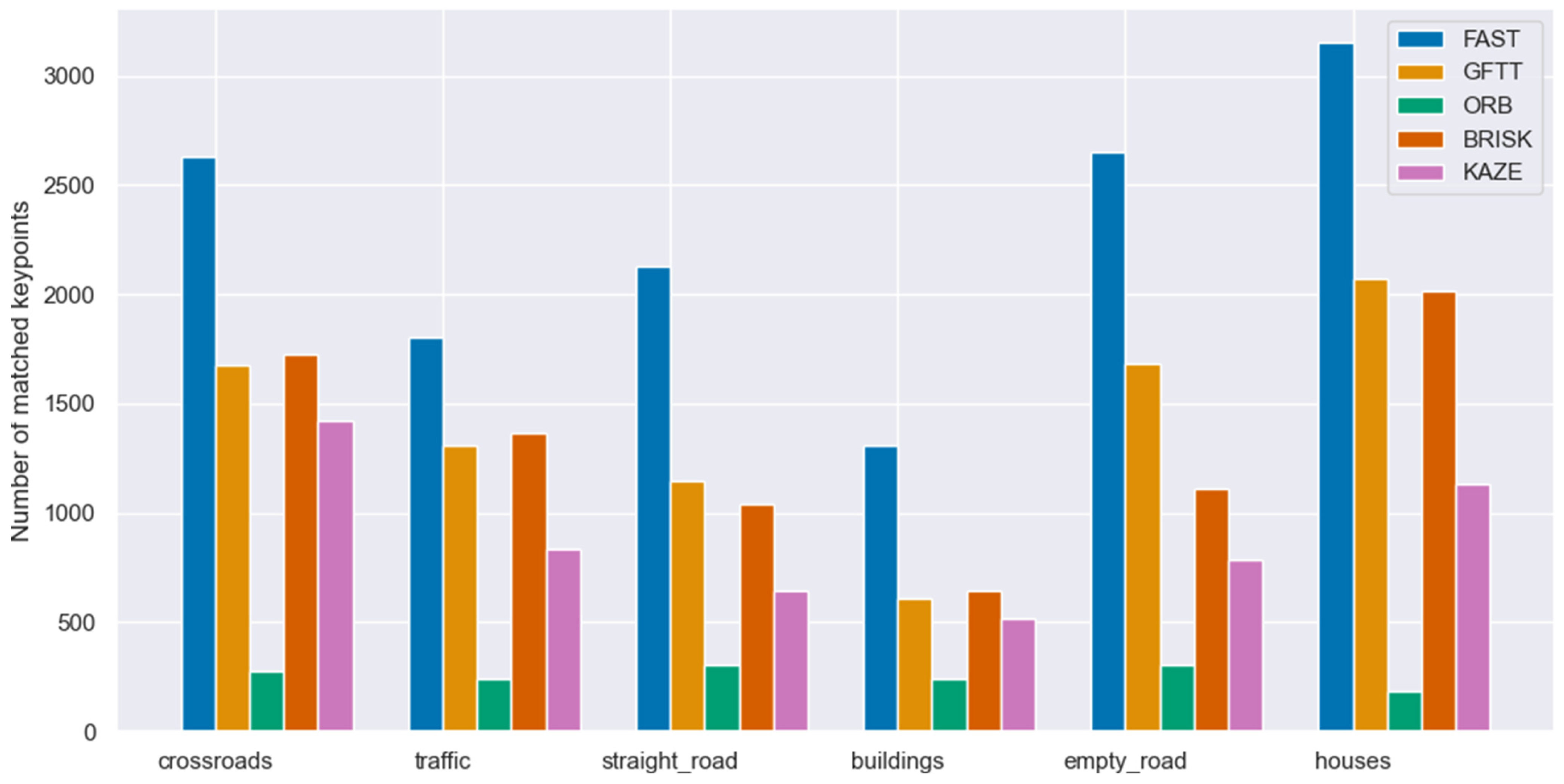 Among the tested algorithms, ORB consistently yields the highest number of keypoints, followed by FAST. In contrast, BRISK and KAZE produce the lowest counts, while GFTT occupies an intermediate position in terms of detection density.