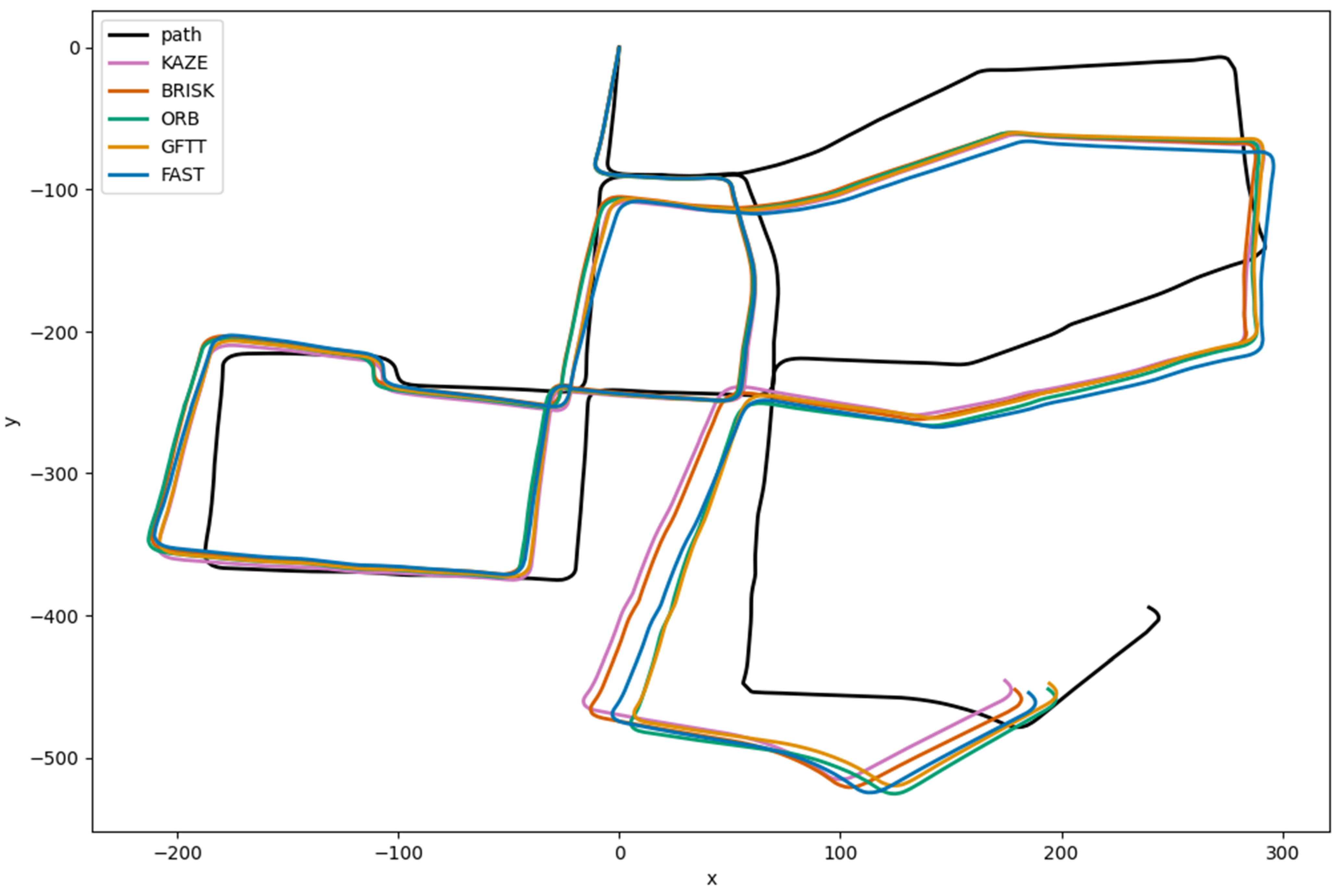 Figure 12 presents a graph that illustrates the drift for successive pairs of stereo image frames. The analysis of this graph can be based on checking which method produces the smallest drift at the last point of the estimated path. The drift achieved for each method at the conclusion of the estimation process is outlined below: