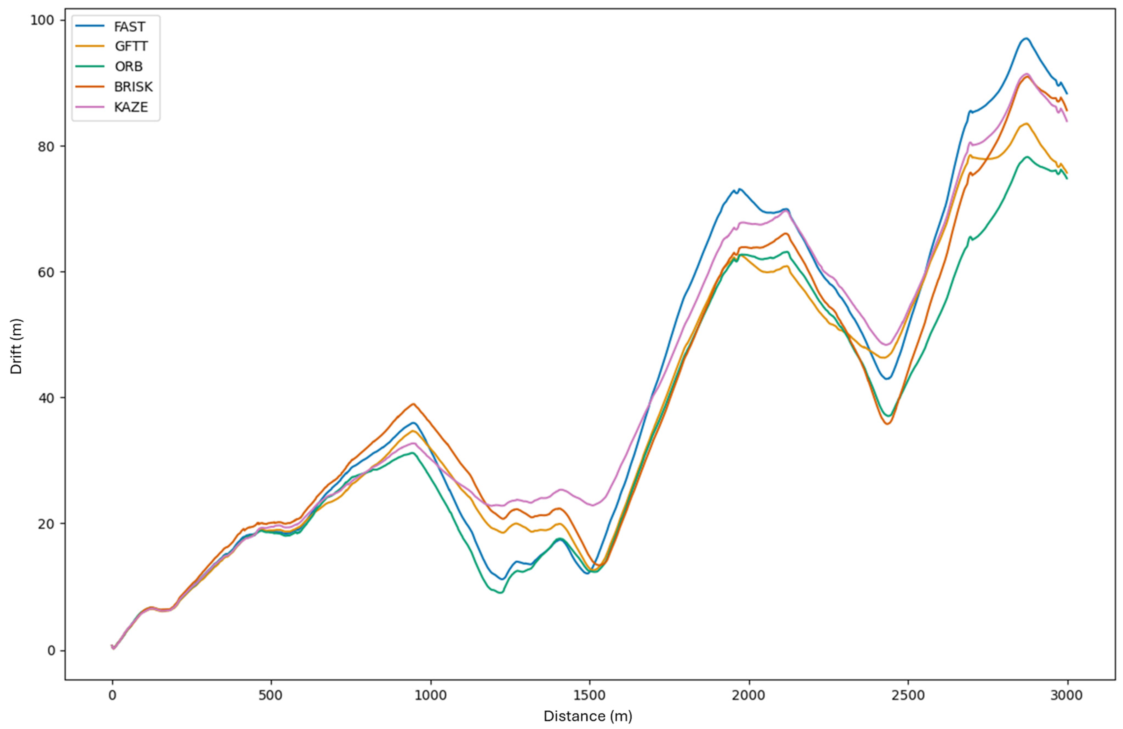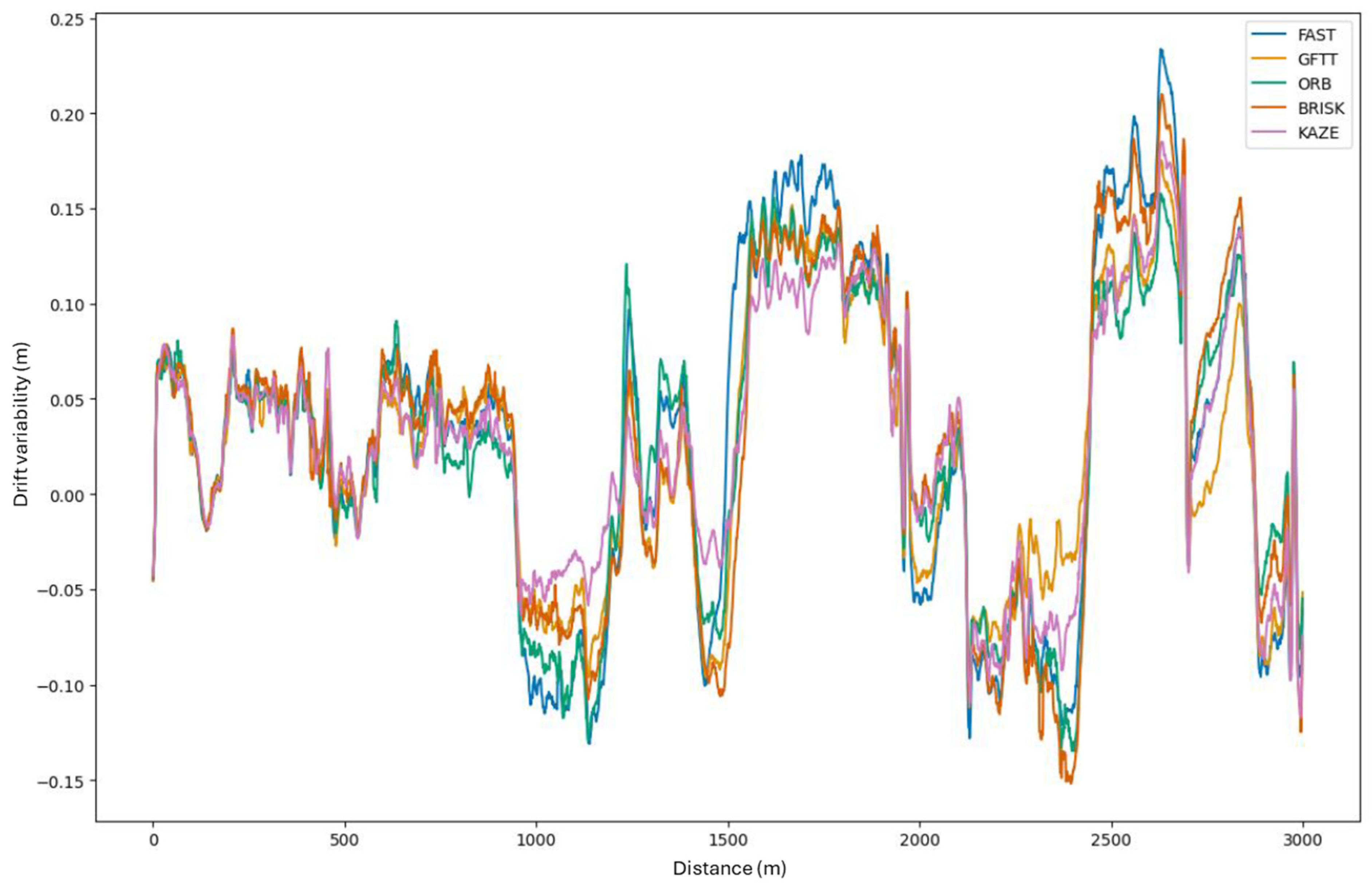 Figure 13 presents a processed graph showing the variability of drift for successive frames of the recorded route. The GFTT method is thus considered to be the least susceptible to changes in the direction of vehicle movement. The drift for this method is subject to the most negligible change. Conversely, the FAST method facilitates the observation of the most rapid changes in drift in individual sections of the graph. In accordance with predictions, the ORB method, which is based on FAST, is characterized by similar drift variability in many places, despite modifications to FAST. The result for the KAZE method is also of interest, as it suggests that it is resistant to changes in direction in the algorithm used. This finding aligns with the extant literature, which highlights its resistance to rotation.