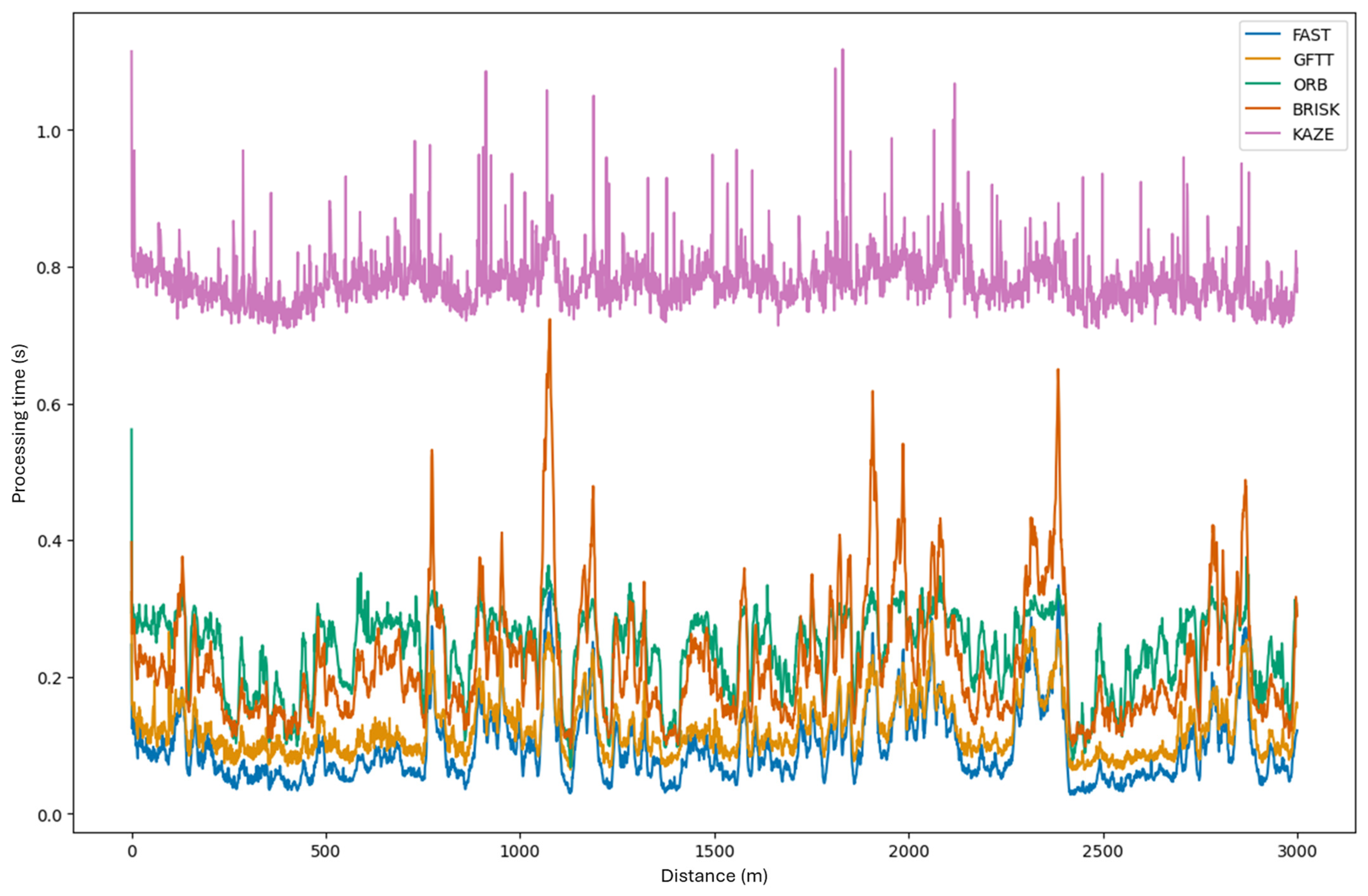 Figure 15 as a graph showing the dependence of the processing time of each image pair in the sequence as a function of frame number versus frame number. A detailed examination of the graph reveals that for the selected dataset, the KAZE method does not align with the established processing time requirements. The data contained within the image sequence have been sampled at a frequency of 2.5 Hz. This results in an upper time limit of 400 milliseconds for the processing time of each image pair. It is worth noting, however, that this method corroborates the conclusions of the preceding study. In instances where frames depict a sudden change in direction (i.e., turns) within the scene, there is no observed increase in processing time. However, as demonstrated in the graph, this phenomenon occurs for all other methods. The phenomenon is characterized by an increase in values, indicative of the temporal extension observed for particular frame numbers. This effect is most pronounced in the BRISK method.