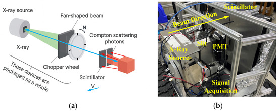 (a) Schematic of the XRBS Compton scattering detection system based on flying-spot scanning; (b) assembled laboratory prototype [20].