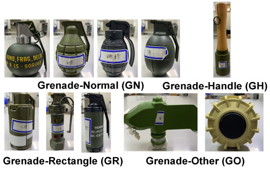As publicly available X-ray datasets are predominantly based on transmission imaging, annotated datasets for XRBS remain limited. In this study, 2000 raw XRBS images were acquired using the proposed intelligent imaging system, featuring ten types of simulated explosives (Figure 2). These simulated explosives are not active explosives but inert models that are only used for research and training purposes. Each image contains between one and five explosive objects. The simulated explosives—constructed from metal or plastic and partially filled with polymethyl methacrylate granules and 5 mm steel balls—were categorized into four shape-based classes: general-shaped (GN), rectangular (GR), other-shaped (GO), and handle-shaped (GH).