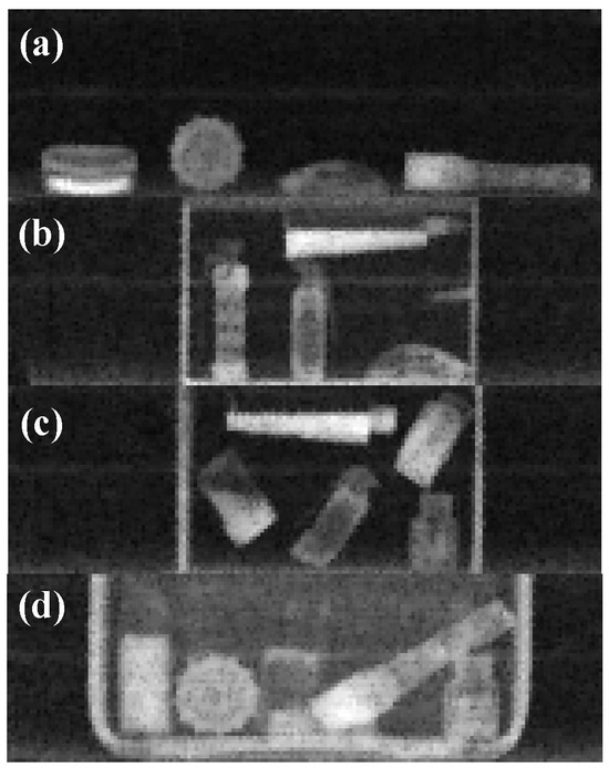 To simulate realistic security inspection scenarios, various distractor objects (e.g., metal tanks, plastic containers, cups) and concealment devices (e.g., cardboard boxes, wooden crates, suitcases) were included, generating diverse occlusions and cluttered backgrounds (Figure 3). Occlusion and backgrounds were physically recreated during the imaging process by placing explosives alongside ordinary items or concealing them inside containers of different thicknesses. This design ensured that the dataset reflects realistic inspection environments with overlapping objects and visually complex scenes rather than artificially synthesized backgrounds.