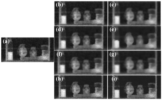 Images processed with four different filtering methods are shown. (a) Original image; (b,c) mean filtering (3 × 3, 5 × 5); (d,e) median filtering (3 × 3, 5 × 5); (f,g) Gaussian filtering (3 × 3, 5 × 5); (h,i) bilateral filtering (radii 30, 50).