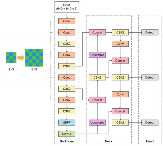 Although YOLOv11 demonstrates strong general-purpose identification capabilities, its baseline configuration is not tailored to the identification of small, low-detail explosive objects in complex XRBS backgrounds [25]. To address this limitation, we introduce an adaptive structural refinement strategy that systematically adjusts the convolutional hierarchy to improve the granularity of feature extraction. Specifically, the network depth was moderately increased to enrich semantic representation, while the convolutional kernel size was expanded from 3 × 3 to 5 × 5 to enlarge the receptive field and capture fine-scale spatial variations (Figure 5). This dual adjustment allows the network to balance global contextual perception with localized detail extraction, thereby enhancing its ability to discriminate small and ambiguous targets.