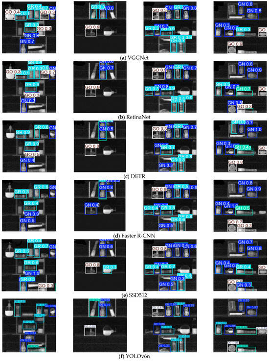 To further analyze the performance of the model across different categories of explosive-like objects, Table 5 reports class-wise detection results. As shown in Table 5, YOLOv11-XRBS achieves the highest accuracy across all four shape categories (GN, GR, GO, and GH). The most significant performance gap is observed in the GH category, which represents handle-shaped explosives with irregular contours and fewer training samples. Faster R-CNN shows moderate performance but struggles with fine structural details in the GH category, while SSD512 exhibits a significant drop in accuracy (80.3%) for detecting small or irregular objects. RetinaNet performs better than SSD512, particularly in small object detection, but still falls short of YOLOv11-XRBS in precision and recall. DETR performs well in object localization but is less effective in detecting small, low-contrast objects like those in the GH category. VGGNet achieves the lowest accuracy across all categories, particularly in the detection of irregular objects. YOLOv11-XRBS benefits from its adaptive architecture and Size-Aware Focal Loss, improving robustness under occlusion and low-detail conditions. These results clearly demonstrate YOLOv11-XRBS’s superiority not only over YOLO variants but also compared to non-YOLO frameworks, underscoring its value for XRBS explosive detection.