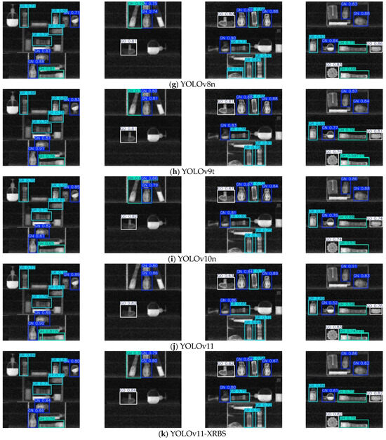 To assess the overall effectiveness of the proposed enhancements, all three components—loss function adjustments, network structure modifications, and small-object detection strategies—were integrated into a unified model, referred to as YOLOv11-XRBS. Comparative experiments on the SBCXray dataset demonstrated consistent performance improvements across multiple evaluation metrics. Notably, the model showed enhanced detection for small and visually challenging explosive objects, particularly those with irregular shapes or partial occlusion. These results indicate that the combined optimizations significantly improve the model’s robustness and accuracy in complex detection scenarios. However, as the components were applied jointly, their individual contributions remain intertwined. Future work will include a more granular ablation analysis to isolate and quantify the marginal effects of each strategy, enabling the more targeted refinement of the model in subsequent iterations.