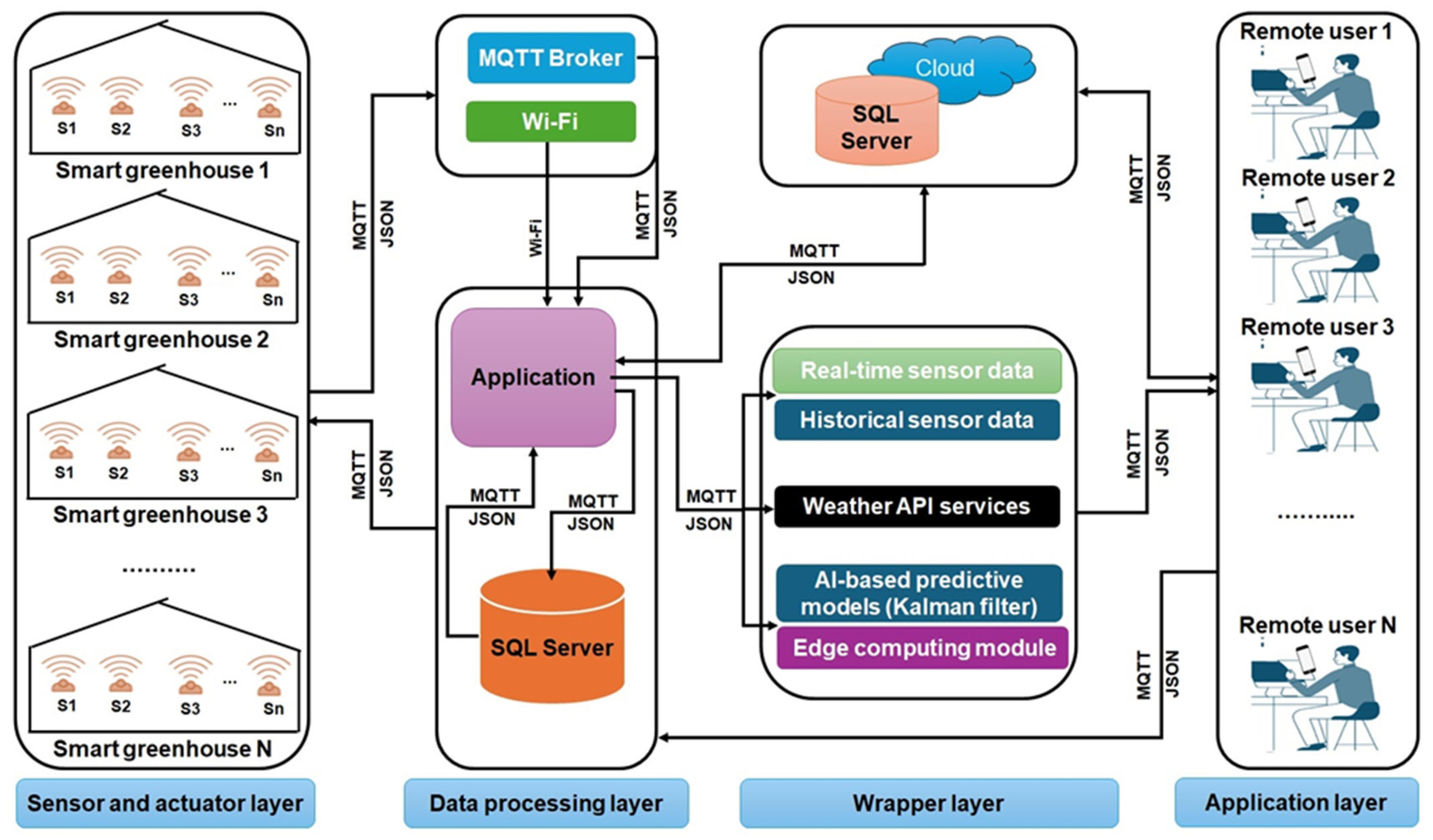 | Edge and cloud-based | Edge computing and cloud analytics | Latency reduction, bandwidth efficiency, anomaly identification | Large-scale smart greenhouse IoT networks | Ensures efficient real-time data handling and resilience | Dependent on connectivity; may raise privacy issues |