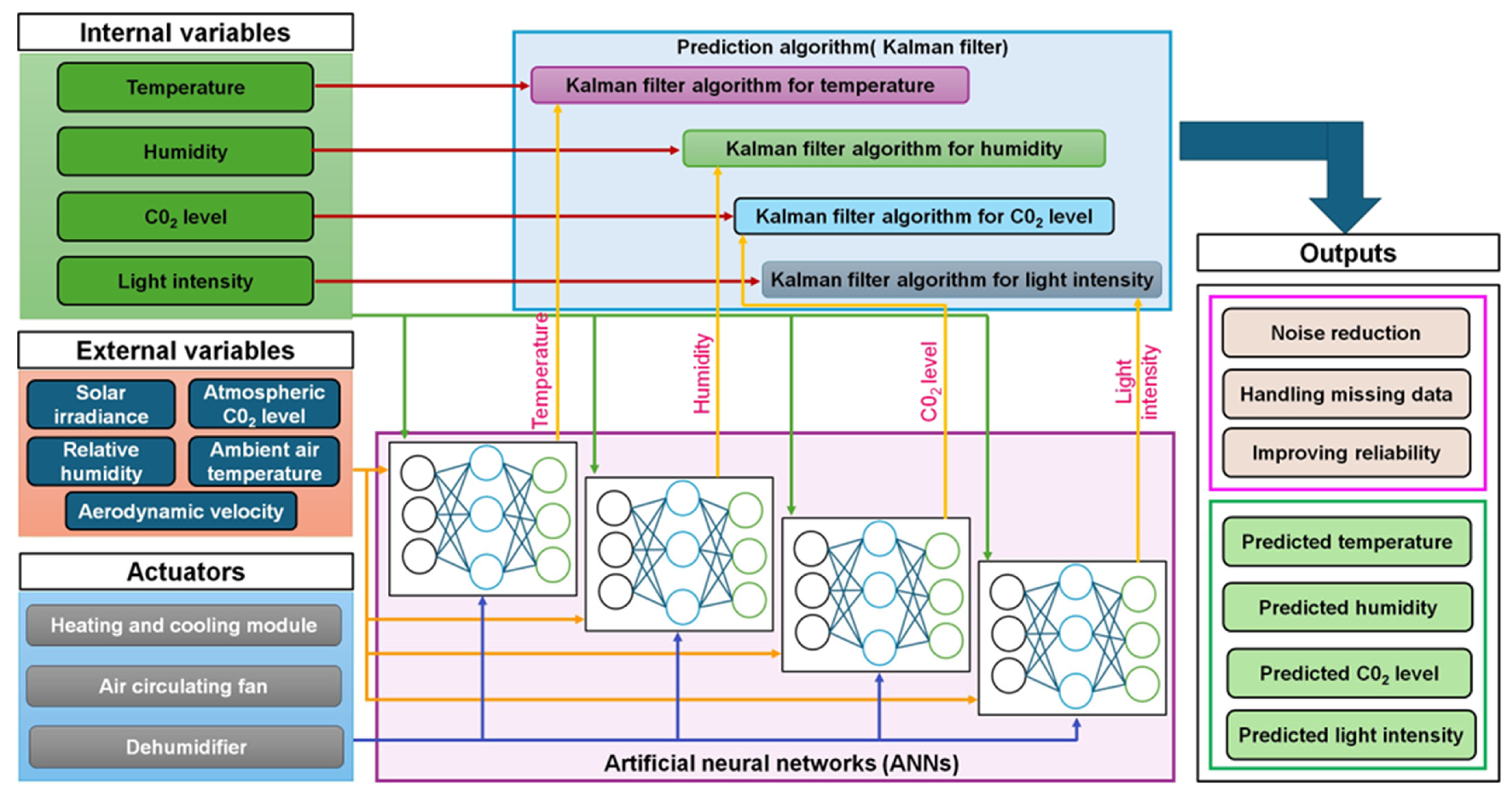 | Kalman + ANN hybrid | Noise reduction, missing data handling, improved prediction accuracy | Environments with strong variability (light, humidity, soil conditions) | Enhances actuator control (e.g., fans, heaters) | Complexity in integration; training required | [92,93,94] | |