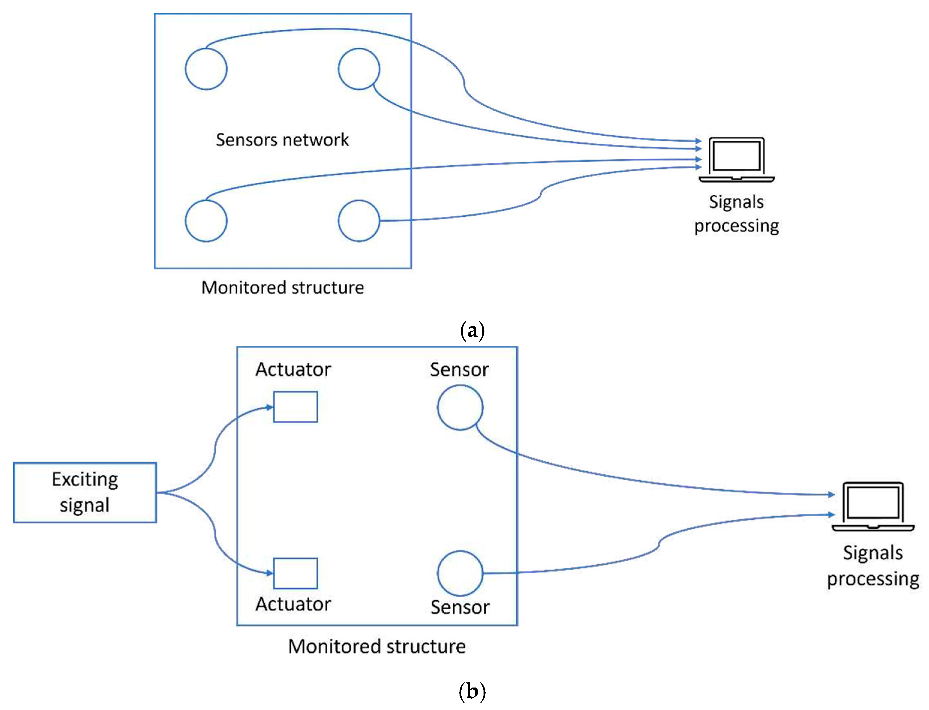 - In active SHM, the structure is triggered via actuator sensors, and its response is detected via receiving ones (Figure 10b).