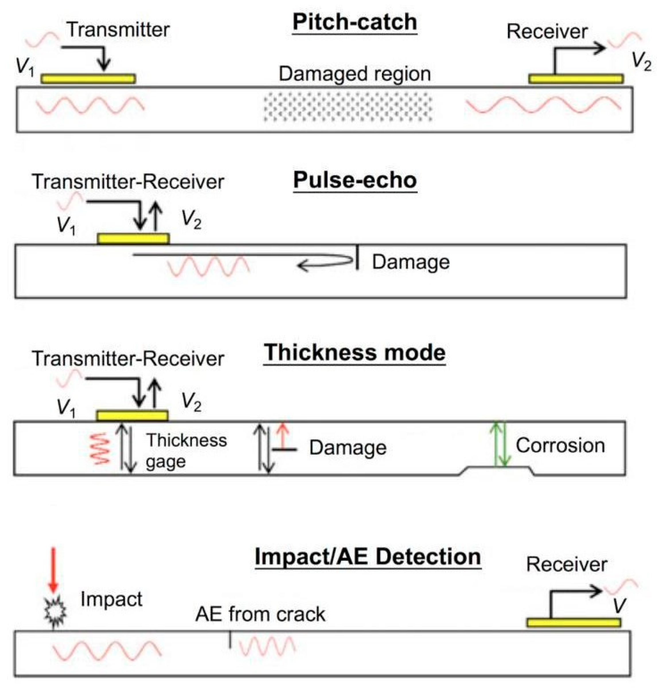 - Pitch-catch, in which there are two sensors, one acting as an actuator to propagate the ultrasonic wave that passes through the structures and reaches the other sensors. The time-of-light (TOF) varies in the presence of a defect.