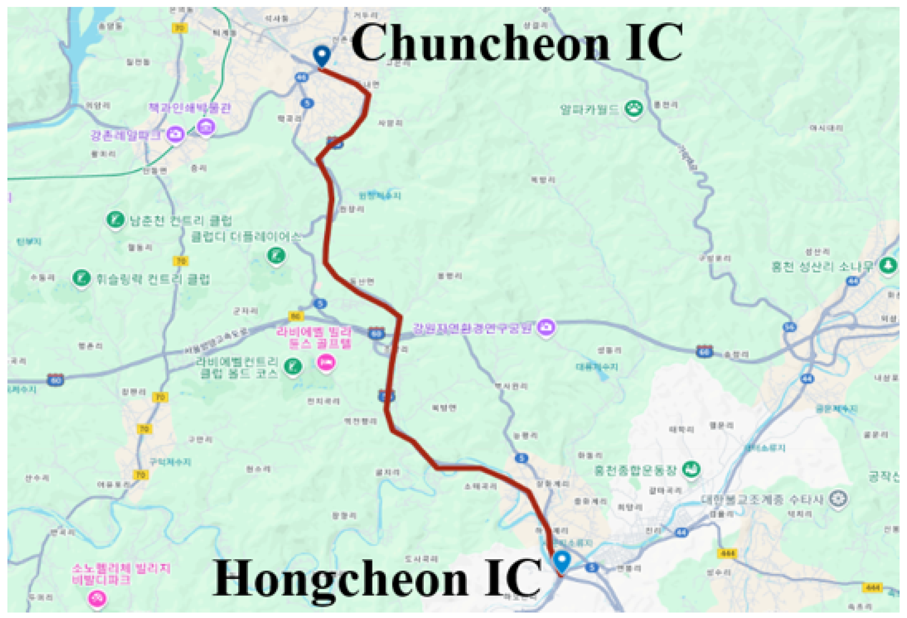 Driving Environment Experiments were conducted on two highway segments: Route A (Chuncheon IC → Hongcheon IC) and Route B (Hongcheon IC → Chuncheon IC). Both segments are typical two- to three-lane highways with a lane width of approximately 3.5 m, well-maintained pavement, and stable surface friction, providing reliable driving conditions. All experiments were conducted on clear days (no precipitation, good visibility) between 2 p.m. and 6 p.m., a period chosen to minimize traffic density variations while ensuring a naturalistic driving environment.