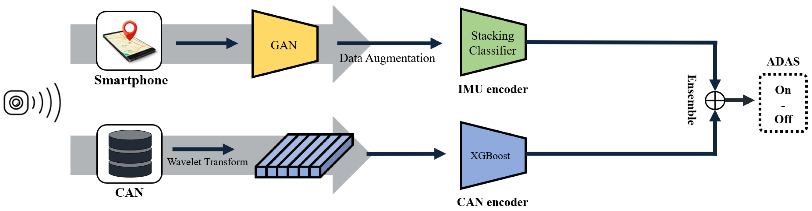 - Ahmadian, R.; Ghatee, M.; Wahlström, J. Discrete wavelet transform for generative adversarial network to identify drivers using gyroscope and accelerometer sensors. IEEE Sens. J. 2022, 22, 6879–6886. [Google Scholar] [CrossRef]