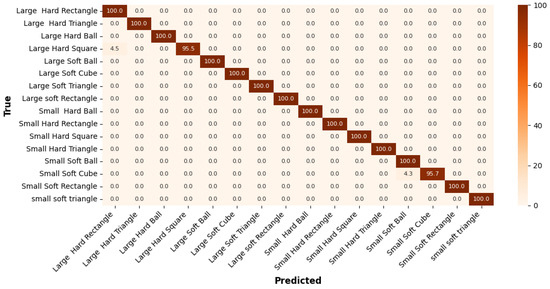 Large Hard Square class with an accuracy of 95.5%, due to a few instances being misclassified as Large hard rectangle. This highlights a slight confusion between square and rectangle shapes, particularly when size and material differ.