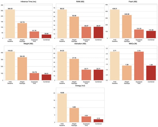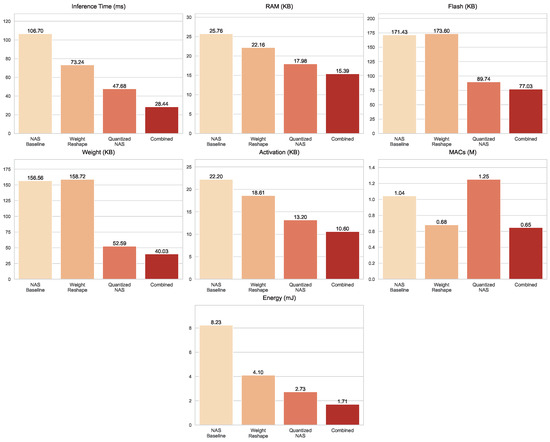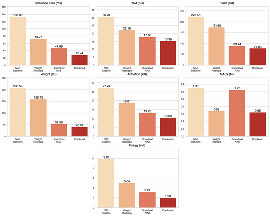 Figure 10. The baseline model was the most computationally demanding, requiring 260 ms per inference, 2.709 million MACs, and 19.66 mJ of energy, with a Flash footprint of 428.31 KB. The Weight Reshape strategy substantially reduced the computational burden, halving MACs to 1.391 million, cutting latency to 137.7 ms, and lowering energy consumption to 9.848 mJ. The Quantized NAS model achieved the most aggressive storage compression, reducing Flash to 131.22 KB and weight size to 104.78 KB, while its computational demand remained relatively high at 2.698 million MACs, while energy per inference dropped to 4.037 mJ. The Combined optimization approach balanced these benefits, achieving the lowest latency at 33.98 ms, minimal storage (110.28 KB Flash, 84.61 KB weights), reduced complexity at 1.384 million MACs, and the lowest energy consumption of 2.118 mJ, making it the most practical choice for deployment.