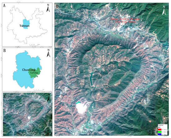 Study area (A) Yunnan Province; (B) Chuxiong City; (C) Dinosaur Valley Ring Structure Area; (D) Satellite Image of the Dinosaur Valley Ring Structure Area.
