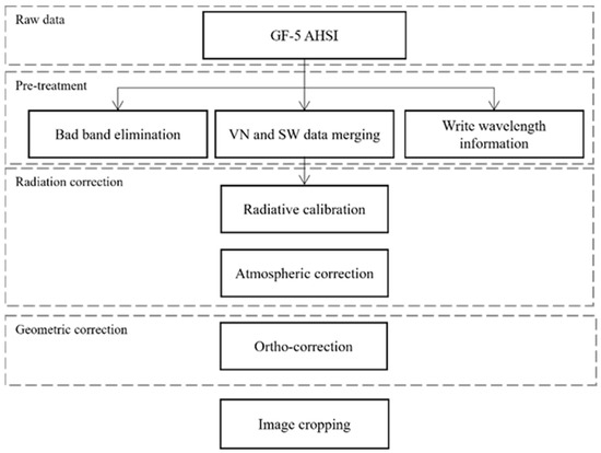 The study data used in this paper is a GF-5 satellite image acquired on 23 December 2019. According to the specific GF-5 satellite hyperspectral load parameters in Table 1, the GF-5 onboard hyperspectral data were preprocessed with bad band rejection, radiometric calibration, atmospheric correction, and orthometric correction [27] (the specific preprocessing flow is shown in Figure 2). Damaged and noisy bands (B151–154, B192–203, B246–267, B314–316, and B325–330) were removed from the images, and the remaining 283 bands were used in subsequent experiments.