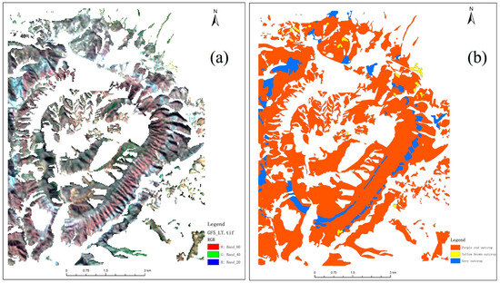 Because the research object of this paper is the outcrop, in order to reduce the impact of other types of ground objects on the experimental results, we reference the same period of high spatial resolution remote sensing images through visual interpretation; the outcrop area in the study area is extracted, as shown in Figure 3a. According to Figure 3a, it can be seen that the outcrops are distributed in a zonal ring, mainly in the circular structure of the study area, and the rest are scattered in the north and southwest of the study area. Considering that hyperspectral remote sensing technology can realize the refinement and classification of outcrops in the study area, the outcrops in the study area are divided into three types by combining the remote sensing images with high spatial resolution, natural geography, and regional geological survey of the study area in the same period, and to the field exploration, the outcrops in the study area are divided into three kinds, namely purple–red outcrop, yellow–brown outcrop, and gray outcrop [28]. The classification results of outcrops are shown in Figure 3b. Then, the vector file of the outcrop classification results is used to cut the GF-5 satellite image for subsequent research.