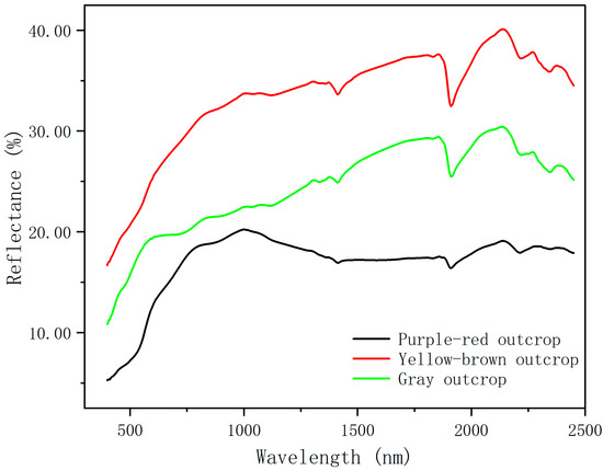 It can be found from Table 4 that the SAD and SID values of the outcrop endmember extracted by the AMEE-PPI algorithm are smaller than those of the original outcrop hyperspectral data. Among them, the SAD and SID values of the purple–red outcrop changed most significantly, which decreased by 0.077 and 0.068, respectively. However, the SAD and SID values of the yellow–brown outcrop had the least significant change, which decreased by 0.039 and 0.014, respectively.
