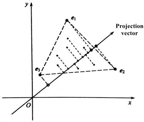 The PPI algorithm is based on the geometric description of the linear mixed model. The endmembers are extracted by using the features of the endmembers, which are the vertices of the simplex formed in the feature space of hyperspectral remote sensing images and the vector projection property of the simplex [29,30,31]. Figure 5 shows the basic principle of the PPI algorithm, and , , and are three data points obtained by the PPI algorithm, shown in the figure. In the eigenspace, if you take the inner product of any vector with a unit vector, you will obtain the number of projection vectors in this unit vector direction. The same direction is positive, the reverse is negative, and the orthogonal is 0. If the exponent of the pure pixel corresponding to a pixel is larger, it means that the pixel is more likely to be an endmember.