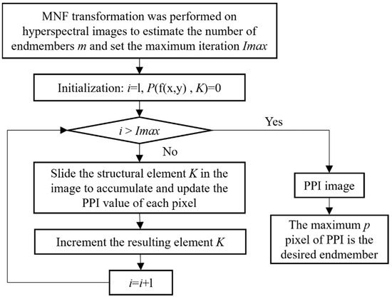 Therefore, inspired by the paper, the AMEE-PPI algorithm process [29] is shown in Figure 6. Consider replacing the MEI with the PPI to represent the purity of pixels in structural elements. The PPI algorithm is used to find the purest pixel in the structure elements, the corresponding purity index is assigned to the pixel, and the dilation and erosion operation in morphology is defined to process the whole image. The size of structural elements is constantly increased, and the PPI values of pixels are repeatedly calculated and updated cumulatively. Finally, an image with a PPI value can be obtained, and the endmember can be selected from the pixel with a larger PPI cumulative value. In this way, the shortcomings of the AMEE algorithm are remedied, and the performance of the AMEE algorithm is improved by combining the AMEE algorithm with the PPI algorithm, namely the AMEE-PI algorithm.