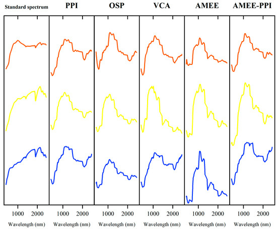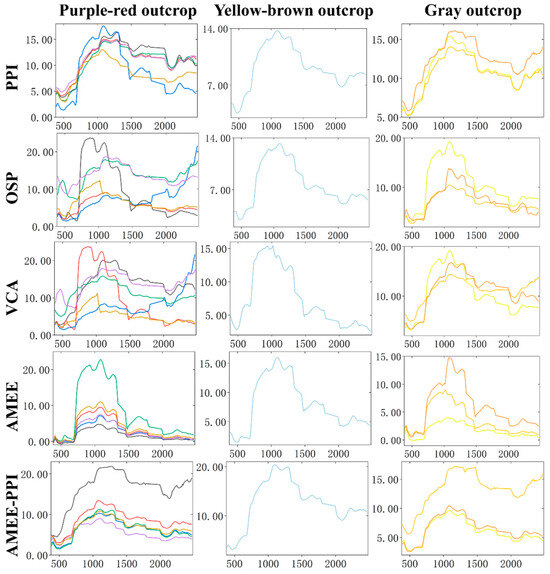 The endmember spectral curves of the purple–red outcrop, yellow–brown outcrop, and gray outcrop in the study area extracted by PPI, VCA, OSP, AMEE, and AMEE-PPI algorithm are shown in Figure 8 and compared with the ground-measured standard spectral curves. It can be seen from the experimental results that, compared with PPI, OSP, VCA, and AMEE, the endmember extracted by the AMEE-PPI algorithm has a higher similarity with the standard spectral curve.