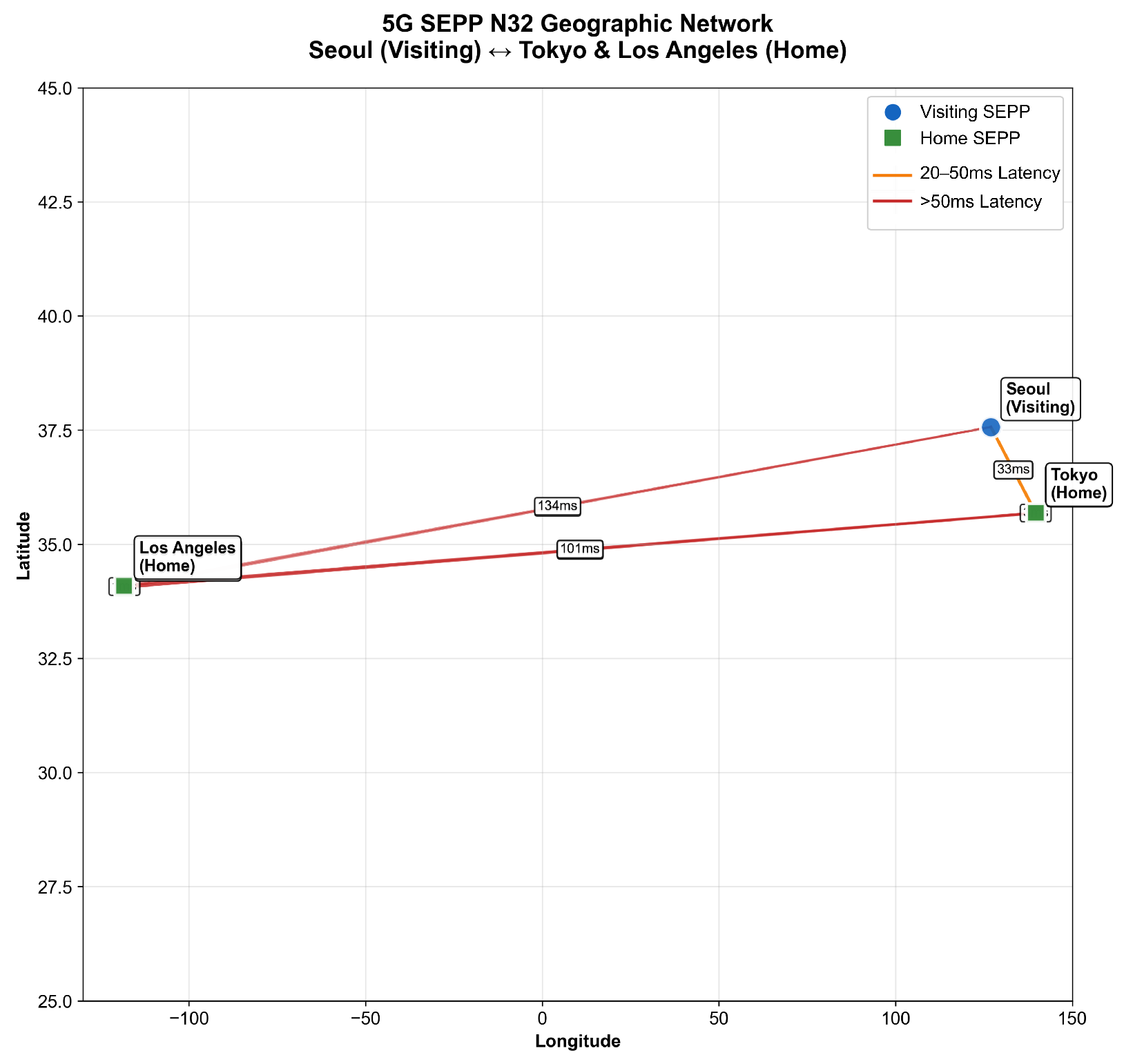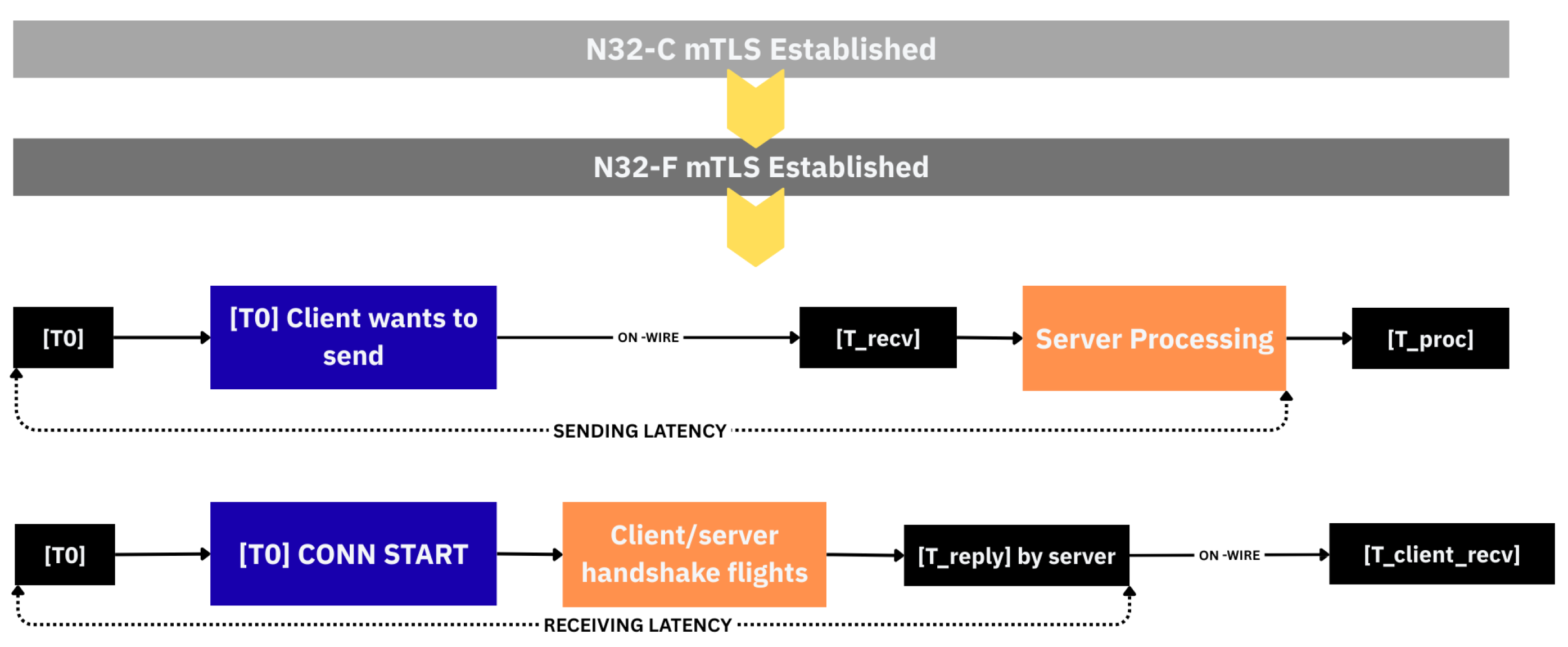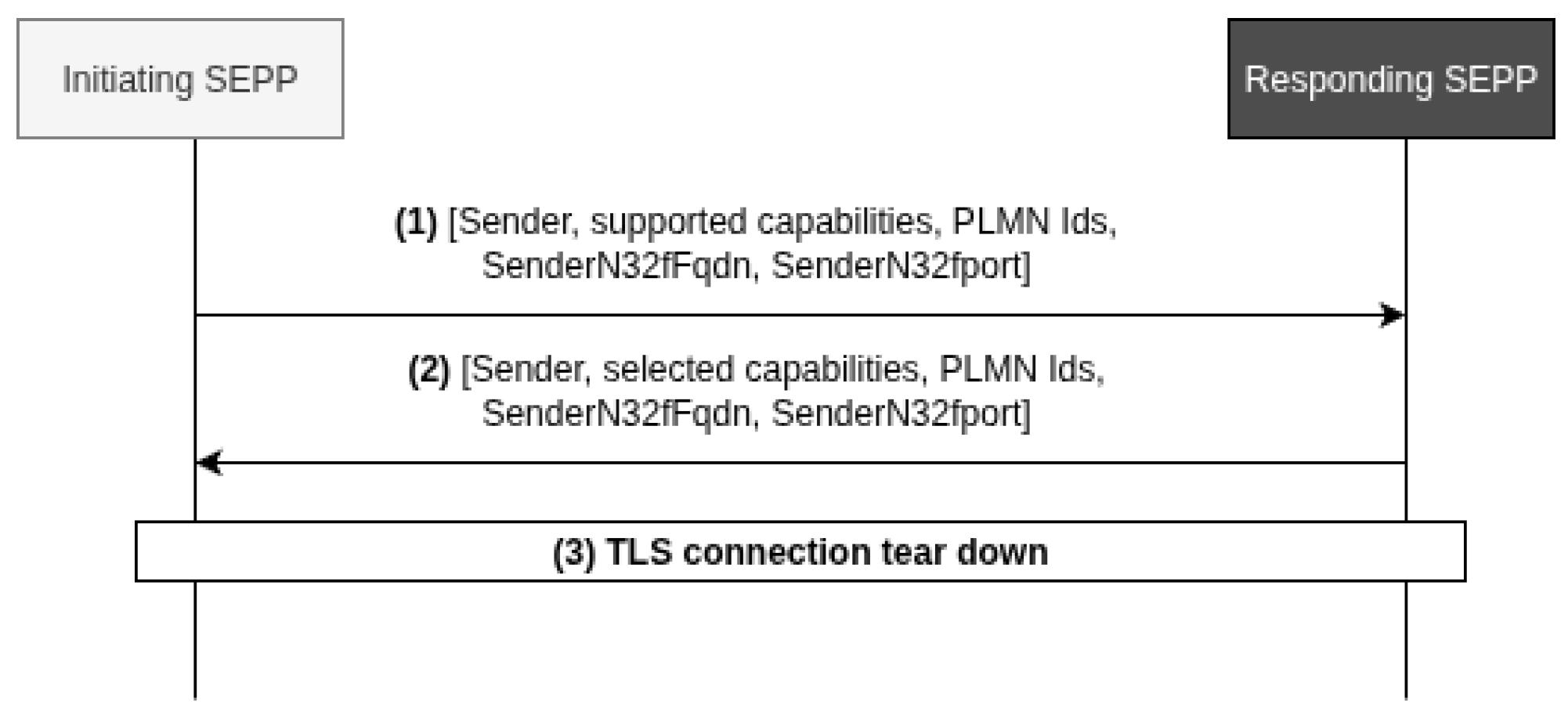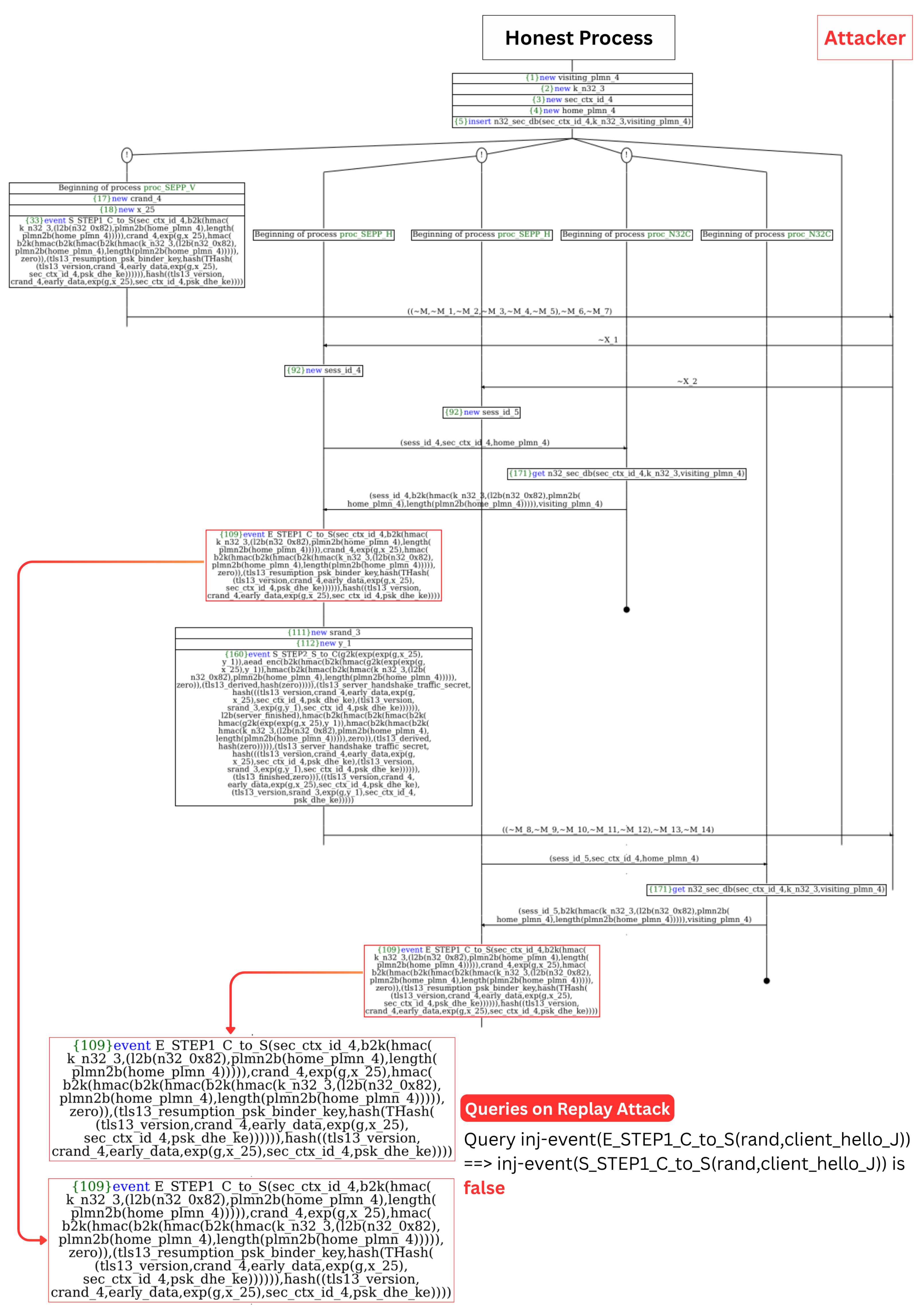 Figure 6 shows a diagram of the ProVerif attack trace for a typical 0-RTT replay attack scenario simulated on the N32 context. The analysis reveals a critical replay attack vulnerability where the same 0-RTT roaming message can be processed multiple times by the home SEPP. This occurs when a single SEPP-V process sends one 0-RTT message with crand_4 and x_25, but the home SEPP processes this identical message twice with different session IDs (sess_id_4, sess_id_5). Since the same cryptographic parameters are used, this results in identical early data encryption that passes validation in both instances, causing both to trigger E_STEP1_C_to_S events. This violates the injectivity property where one authentic send event corresponds to multiple receive events, enabling replay attacks on roaming signaling.