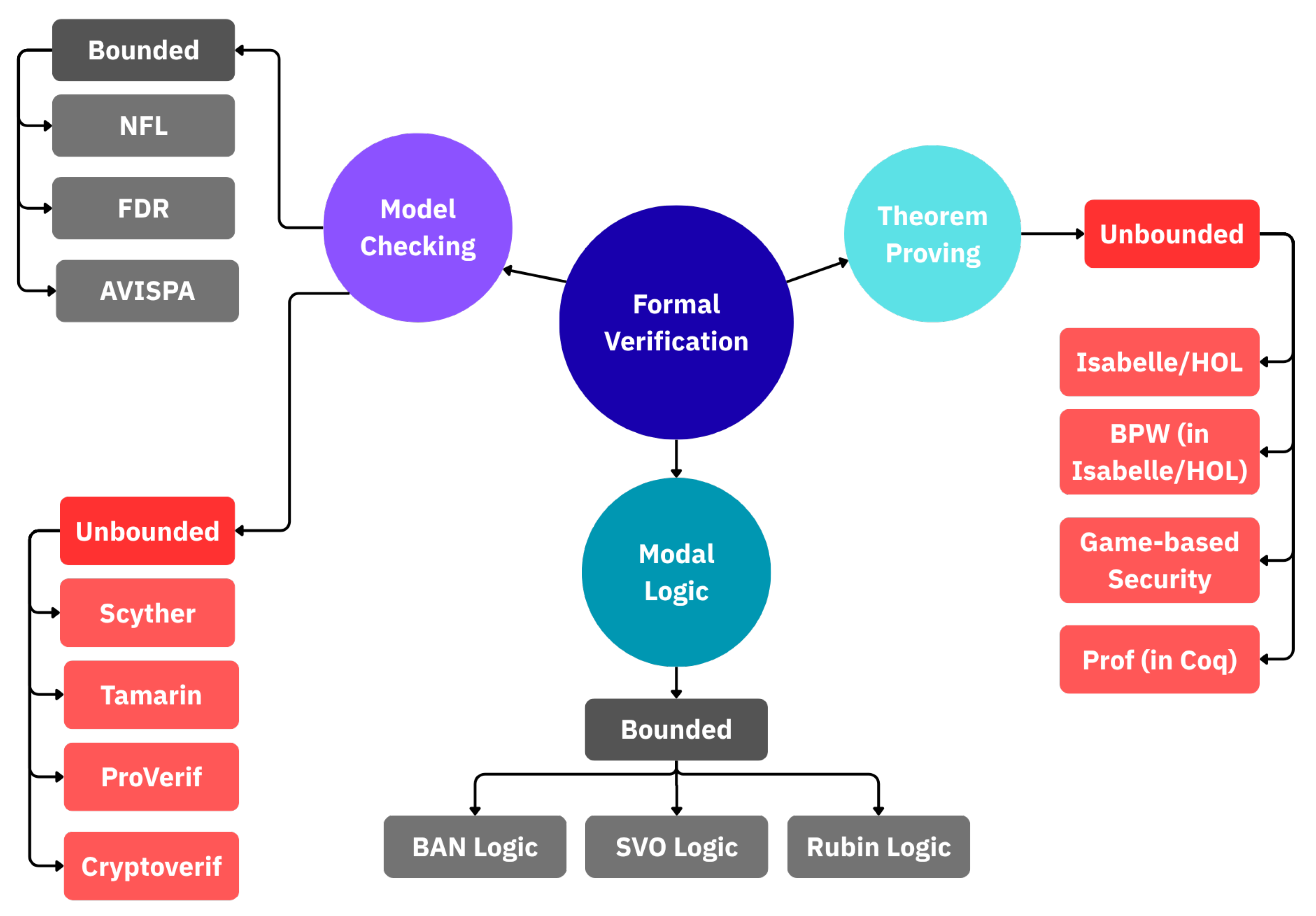 Figure 5, ProVerif belongs to the category of unbounded model checking tools, meaning it can analyze protocols with an arbitrary number of sessions and messages rather than being restricted to finite state spaces.