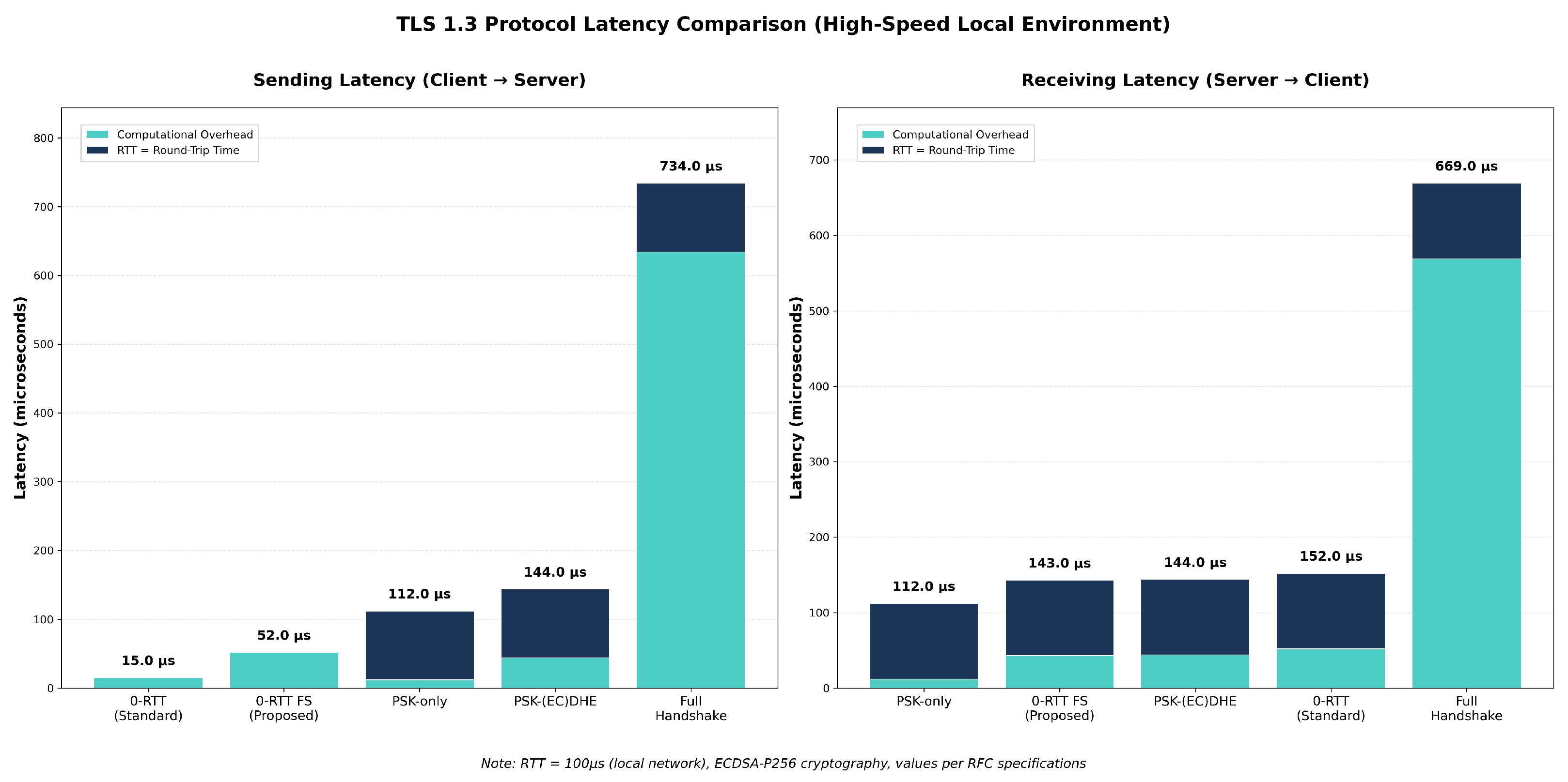Replay attack resistance analysis reveals vulnerabilities across standard implementations. All conventional TLS 1.3 options demonstrate susceptibility to signaling-level replay attacks due to the absence of freshness mechanisms in ClientHello messages. Standard 0-RTT exhibits additional data-level replay vulnerability due to immediate early data transmission. The proposed 0-RTT FS provides comprehensive anti-replay protection through configurable defense mechanisms, including single-use ticket tracking, ephemeral key-based bloom filters, and application-level idempotency tokens.