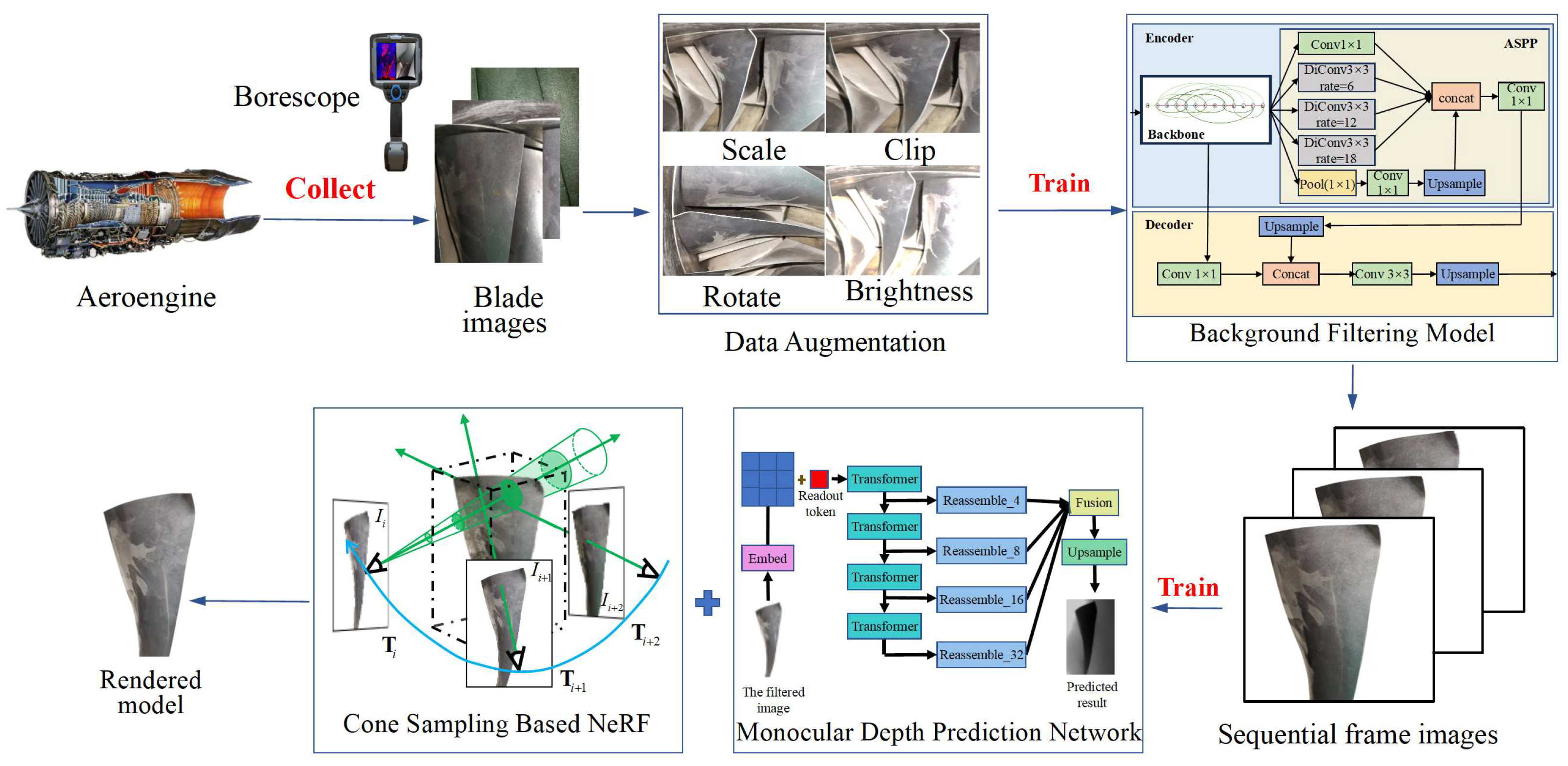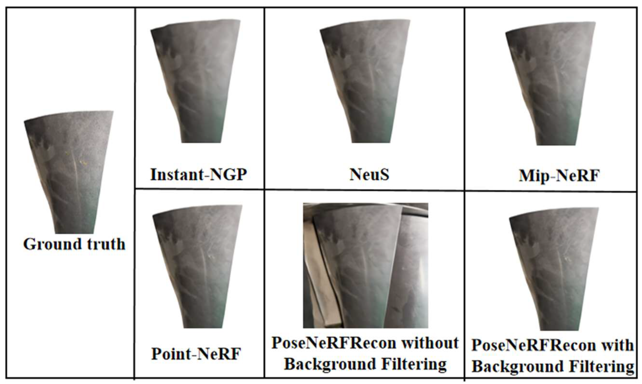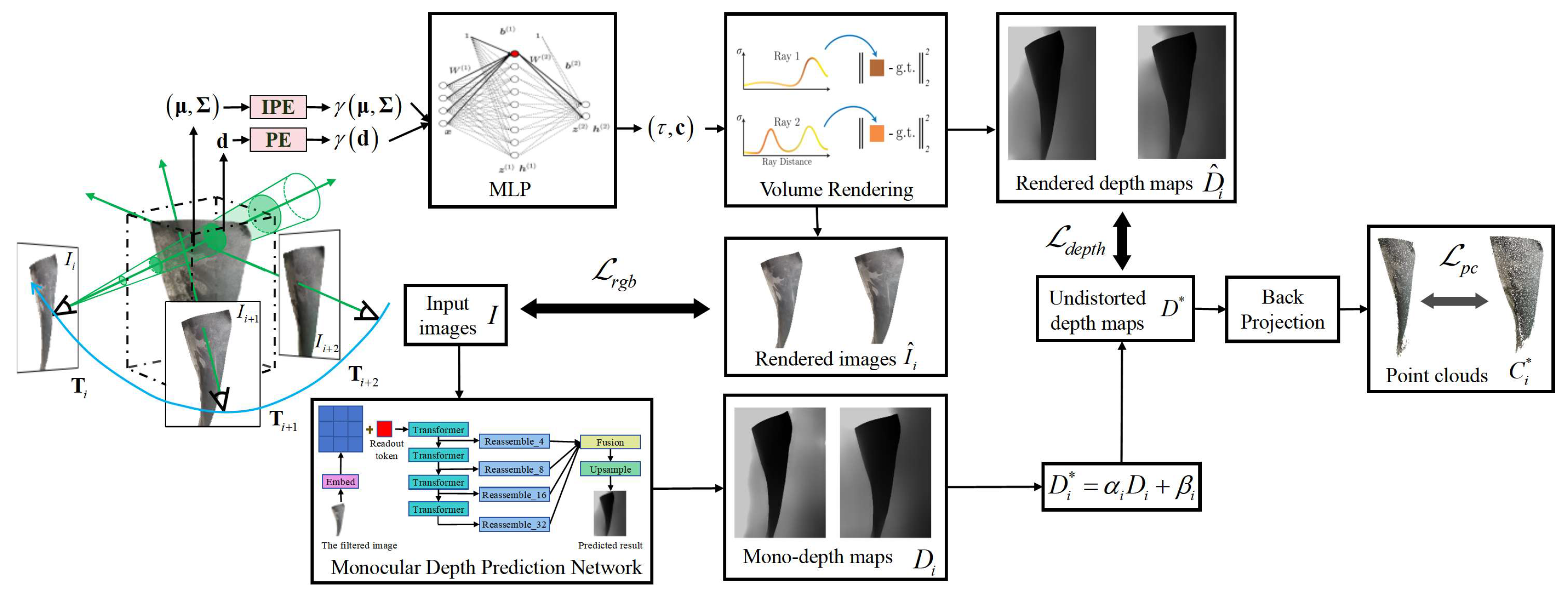 - An implicit 3D reconstruction method based on cone sampling and “pose–NeRF” joint optimization is designed to solve the problems of excessive blur, aliasing artifacts, and other problems caused by smooth blade surface, weak texture information, and other factors, as well as the cumulative error caused by camera pose pre-estimation.