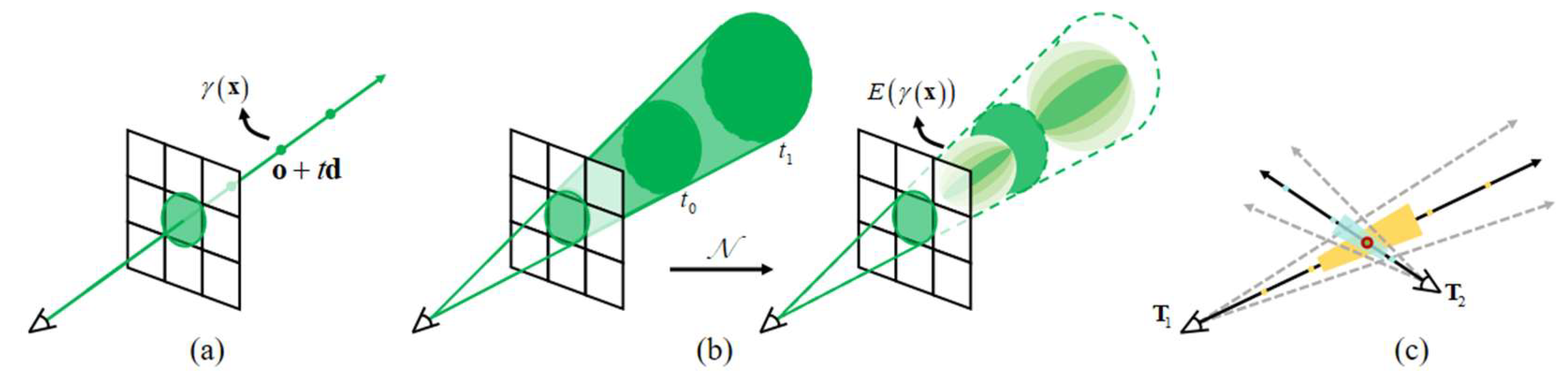 - Barron, J.T.; Mildenhall, B.; Tancik, M.; Hedman, P.; Martin-Brualla, R.; Srinivasan, P.P. Mip-NeRF: A multiscale representation for anti-aliasing neural radiance fields. In Proceedings of the IEEE/CVF International Conference on Computer Vision (ICCV), Montreal, QC, Canada, 10–17 October 2021; pp. 5835–5844. [Google Scholar]