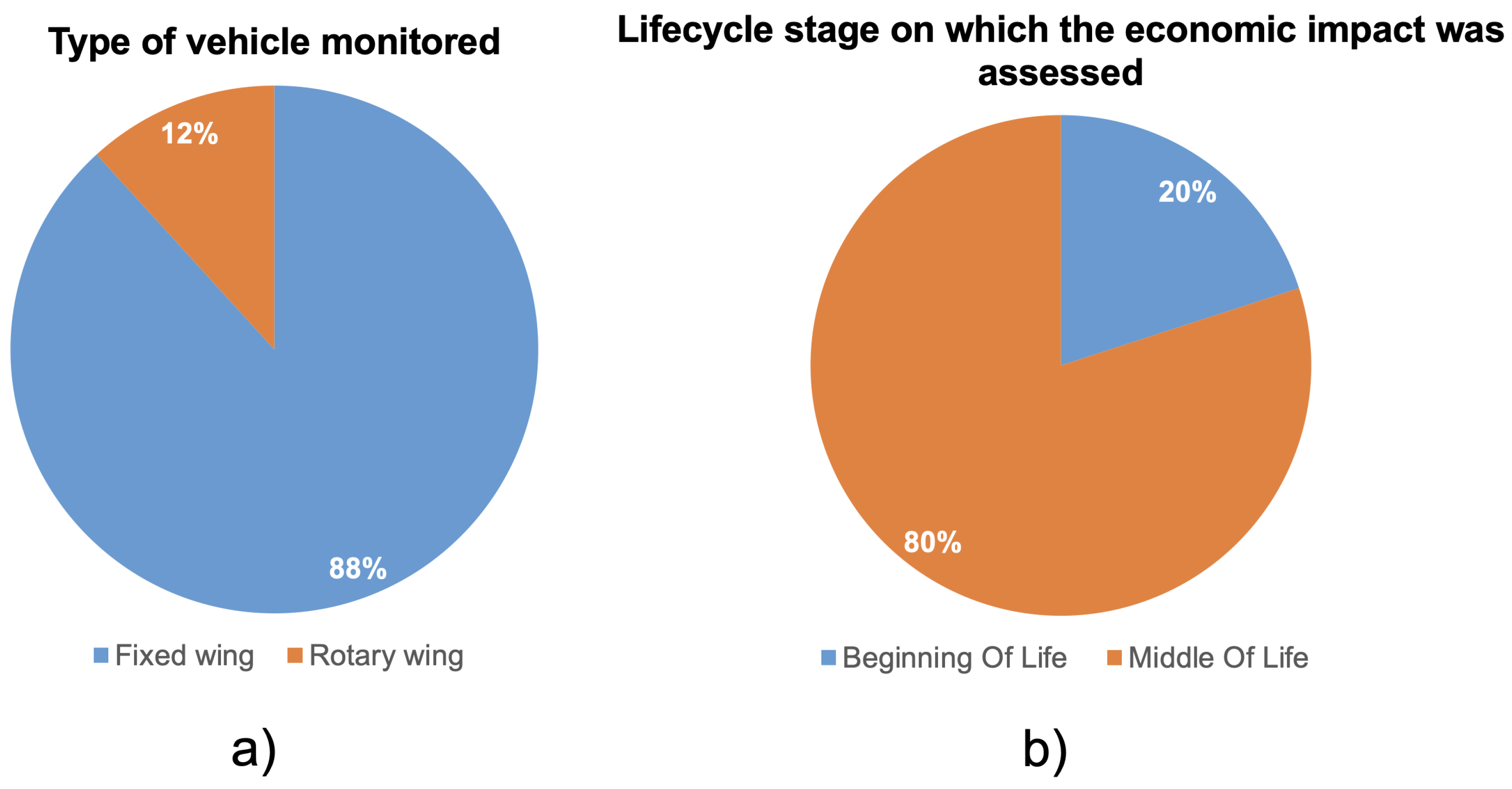 - Type of vehicle monitored: While the majority of the reviewed literature focuses on fixed-wing aircraft, only a small fraction (12%) addresses rotary-wing aircraft (Figure 2a). This imbalance is not merely descriptive—it suggests a potential research gap. Rotary-wing aircraft, such as helicopters, often operate under severe dynamic loads and are subject to higher vibration levels, which make them strong candidates for SHMS implementation. Moreover, differently from fixed-wing aircraft, their mission profile may change significantly from one helicopter to another, thus further motivating the adoption of SHMS. Their underrepresentation in the economic literature may indicate challenges related to data availability, complexity of modeling, or lower commercial prioritization. This trend reveals that the current body of economic evaluations may be disproportionately shaped by platform accessibility rather than operational criticality—an insight that should inform future research targeting high-need segments.
