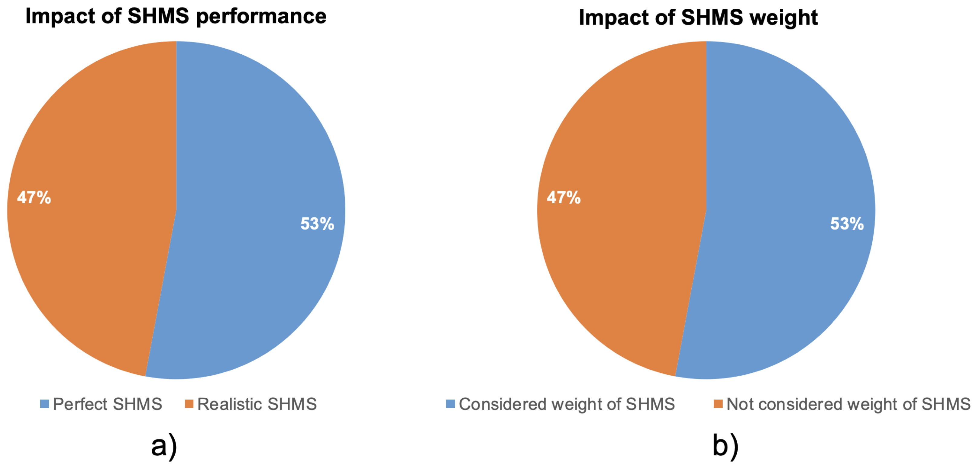 - Impact of SHMS weight: The additional weight introduced by SHMS—whether from sensors, wiring, data acquisition units, or power sources—can have a substantial impact on aircraft performance. When MTOW limits are fixed, any added mass can either reduce payload capacity or increase fuel consumption over the aircraft’s lifecycle, thus directly influencing economic viability.In our review, studies were classified based on whether they explicitly included SHMS weight in their economic evaluation. As shown in Figure 4b, 53% of the studies accounted for the effects of added mass, while the remaining 47% omitted this factor altogether. This nearly even split highlights a key inconsistency in cost modeling practices: while over half of the studies attempt to reflect real-world integration constraints, a significant portion still rely on massless or abstract SHMS models.The omission of weight considerations can bias economic conclusions, as it disregards one of the most tangible trade-offs in SHMS adoption. Even modest increases in structural weight can result in meaningful lifecycle fuel penalties, especially in fuel-sensitive missions such as long-haul commercial flights or high-frequency regional operations. Interestingly, some of the studies that do model SHMS weight still report positive economic outcomes, suggesting that weight penalties can be mitigated or outweighed by benefits such as inspection cost reduction, increased aircraft availability, or reduced unscheduled maintenance. However, this finding also raises questions about how weight-related costs are calculated—and whether all studies use consistent assumptions regarding fuel burn sensitivity, mission profiles, or integration architectures.Overall, the treatment of SHMS weight in the literature remains fragmented, revealing a need for standardized modeling approaches that transparently incorporate mass-related penalties. Without this, comparisons between studies—and reliable conclusions about the cost-effectiveness of SHMS—remain difficult to make.