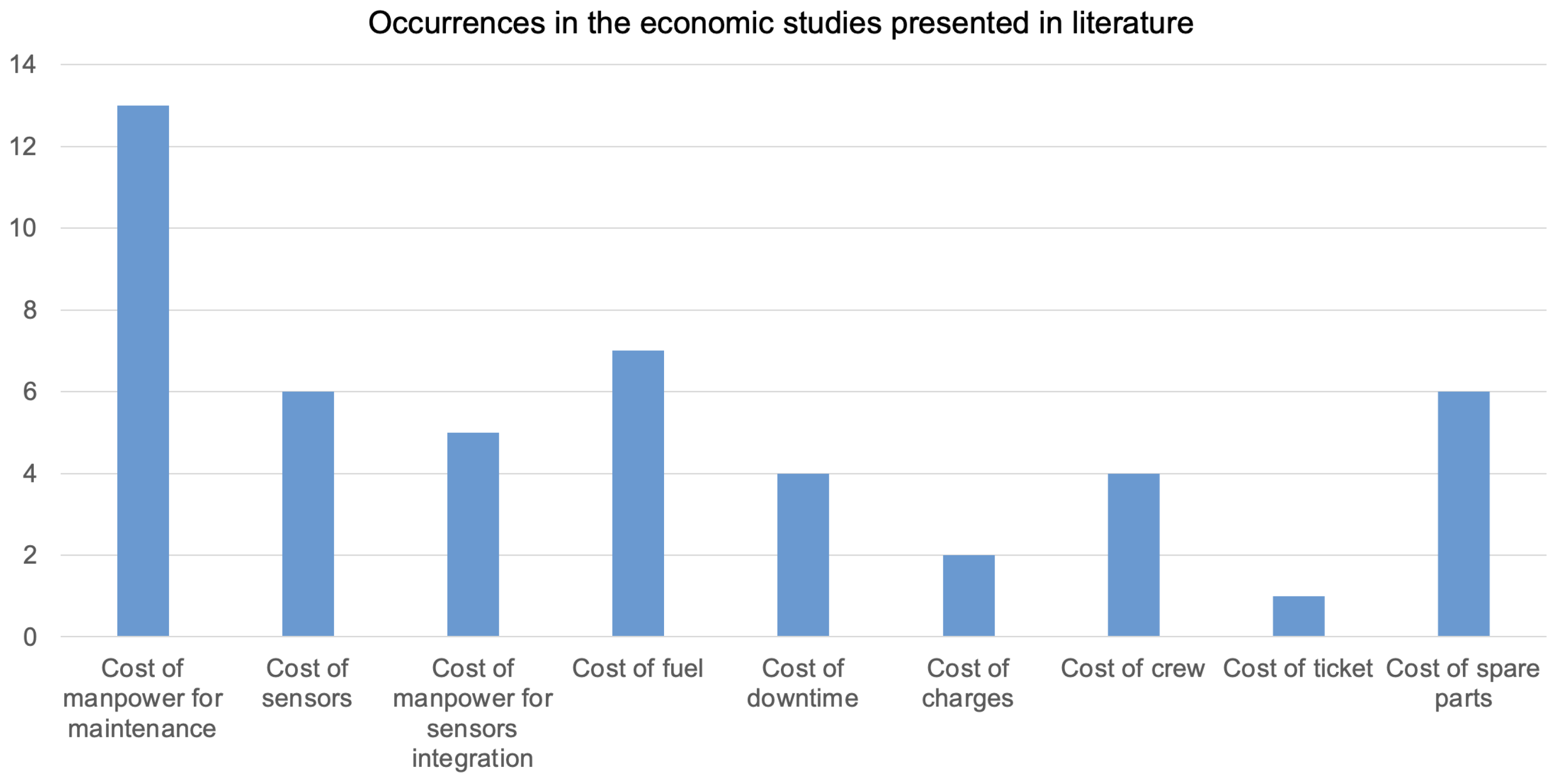 - Impact of SHMS power consumption: Beyond structural weight, an SHMS imposes an electrical power demand that can subtly but meaningfully impact aircraft efficiency. Since onboard electricity is typically generated by the engines—either directly or via auxiliary power units—any additional power draw translates into increased fuel burn, particularly on long-haul flights or for aircraft operating in power-sensitive environments.As shown in Figure 5, only one of the reviewed studies considered this factor, and estimated a contribution of the cost related to the SHMS energy supply to be more or less 26% of the cost induced by the mass of the SHMS. This omission suggests that energy use is largely neglected in current cost-benefit frameworks, despite being an essential contributor to operational cost—especially as SHMS architectures become more complex and sensor-dense.This trend may stem from the relatively small magnitude of SHMS power draw per flight, leading some researchers to treat it as negligible. However, when considered across thousands of flight hours, the cumulative energy cost—especially for continuously operating systems such as Online SHM—can become non-trivial. Moreover, aircraft with more electric architectures will be even more sensitive to power distribution trade-offs, making this an increasingly relevant variable.The failure to consider power consumption also raises methodological concerns, as it introduces an optimistic bias in systems that offer real-time monitoring but at a continuous energy cost. Without accounting for this dimension, economic evaluations may overestimate the net benefit of such systems—particularly in marginal cases where lifecycle savings are small.Moving forward, future SHMS economic assessments should treat energy demand not as an optional parameter but as an integrated part of the system-level trade-off analysis, especially as aviation moves toward electrified and hybrid propulsion systems, where electrical efficiency becomes mission-critical.
