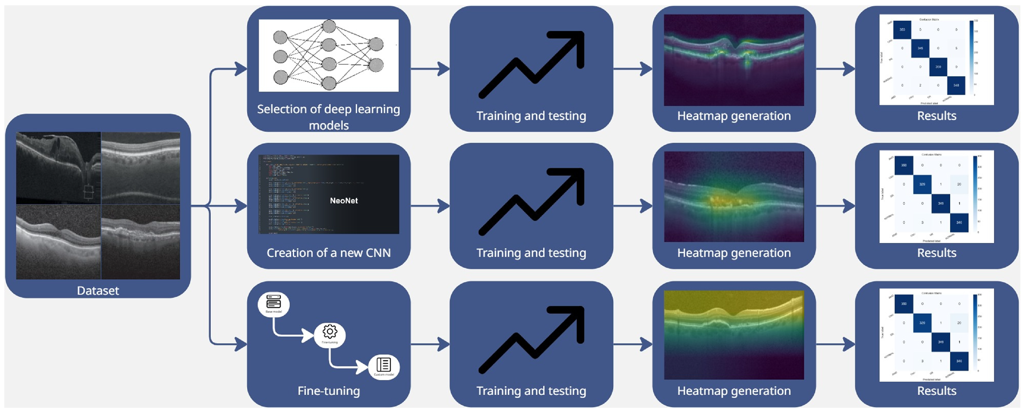 Following the selection of the dataset, the first step of the proposed method involved training several pre-existing CNNs in order to evaluate their performance in classifying retinal images and to generate explainability using Grad-CAM. The second step involved the design and development of a new network, i.e., NeoNet, specifically designed for retinal disease classification. With the NeoNet model, we conduct experiments, generate the Grad-CAM visualizations, and we analyze the resulting outcomes.