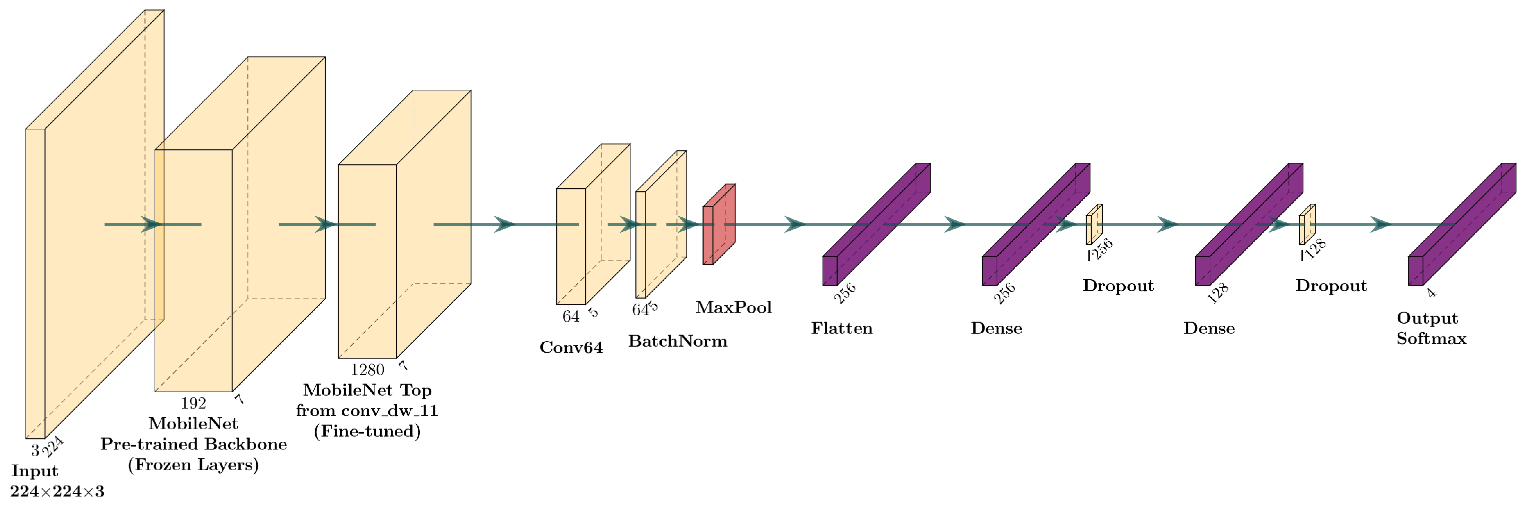 MobileNet is one of the models used for fine-tuning that takes advantage of the pre-trained architecture on ImageNet. The architecture uses MobileNet’s pre-trained convolutional layers, initially kept frozen to preserve the information acquired during training on a large generic dataset. Then, from the output of the base model, a new processing path is introduced that includes a convolutional layer with 64 3 × 3 filters and ReLU activation, followed by batch normalization to stabilize activations and improve convergence. To reduce the spatial dimensionality of the feature maps and retain the most relevant information, a ma pooling layer with a 2 × 2 window is employed. After this convolutional stage, a Flatten layer transforms the data into a one-dimensional vector, which is then processed by two fully connected layers with 256 and 128 units, both equipped with ReLU activation. To limit the risk of overfitting, a 50% dropout is applied to both. The output layer uses a softmax function, which generates a probability distribution among the classes in the dataset. During fine-tuning, the model adopts a strategy of progressively unlocking the layers, allowing the weights to be updated from the “conv_dw_11” layer of MobileNet. This approach allows selective adaptation of the representations without compromising the general features extracted from the initial convolutional layers.