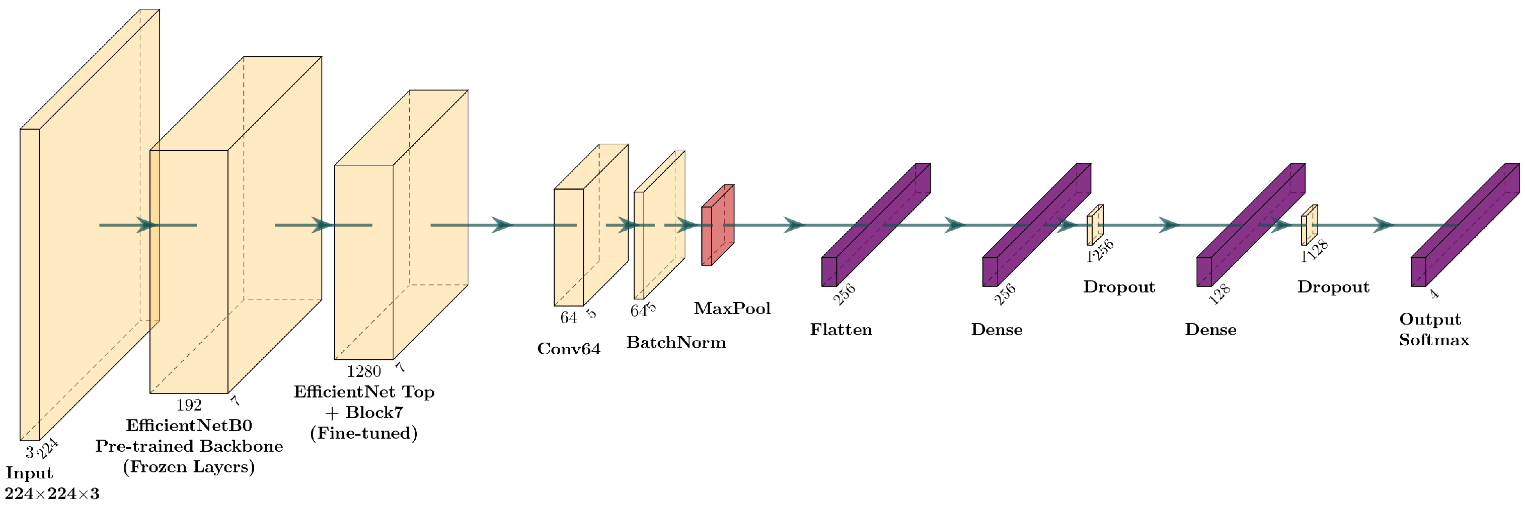 In the case of EfficientNetFT, the model uses EfficientNetB0 as a pre-trained network on ImageNet for feature extraction. Compared with the MobileNet-based version, a Conv2D layer with 64 filters and ReLU activation is added before the pooling phase, followed by batch normalization to stabilize learning. The phase of unlocking the weights for fine-tuning is set from block “block6”, allowing deeper layers of the network to be updated during training. In