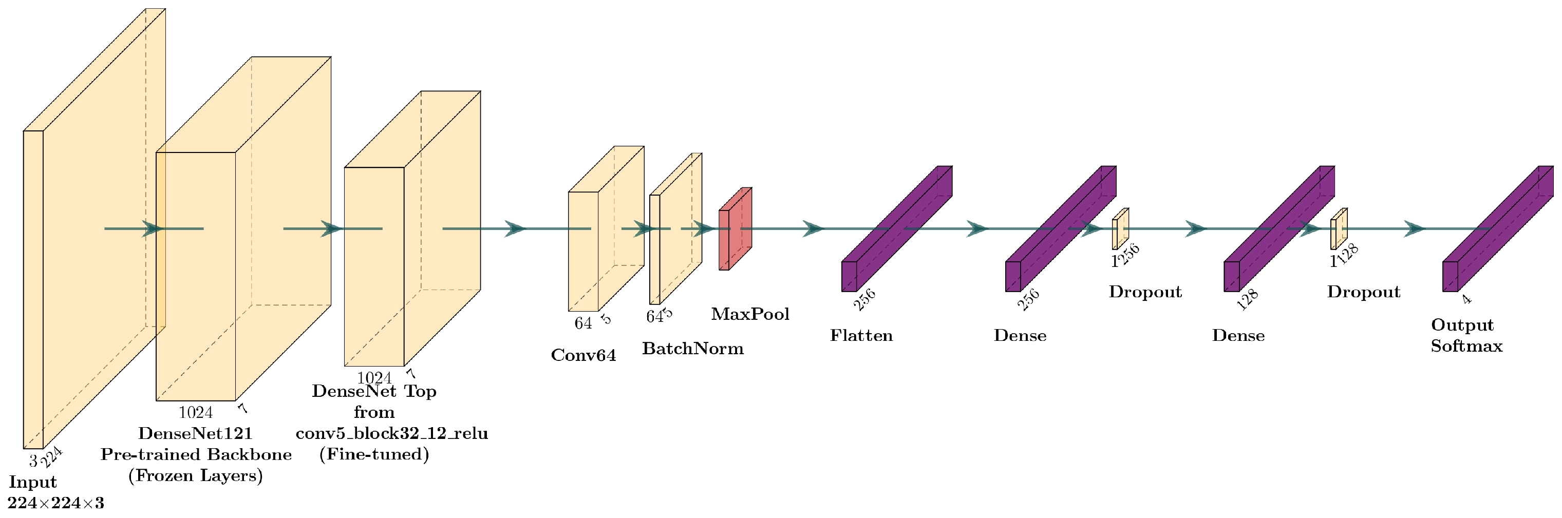 For fine-tuning the DenseNet model, the DenseNet121 model is used for feature extraction, again with pre-trained weights. Compared to the EfficientNetFT version, no additional convolutional layers are added: the first layer of the custom head is directly a MaxPooling2D, followed by two fully connected layers with 50% dropout to reduce the risk of overfitting. Fine-tuning is enabled from the “conv5_block3” block, allowing the high-level features of the network to be updated. In