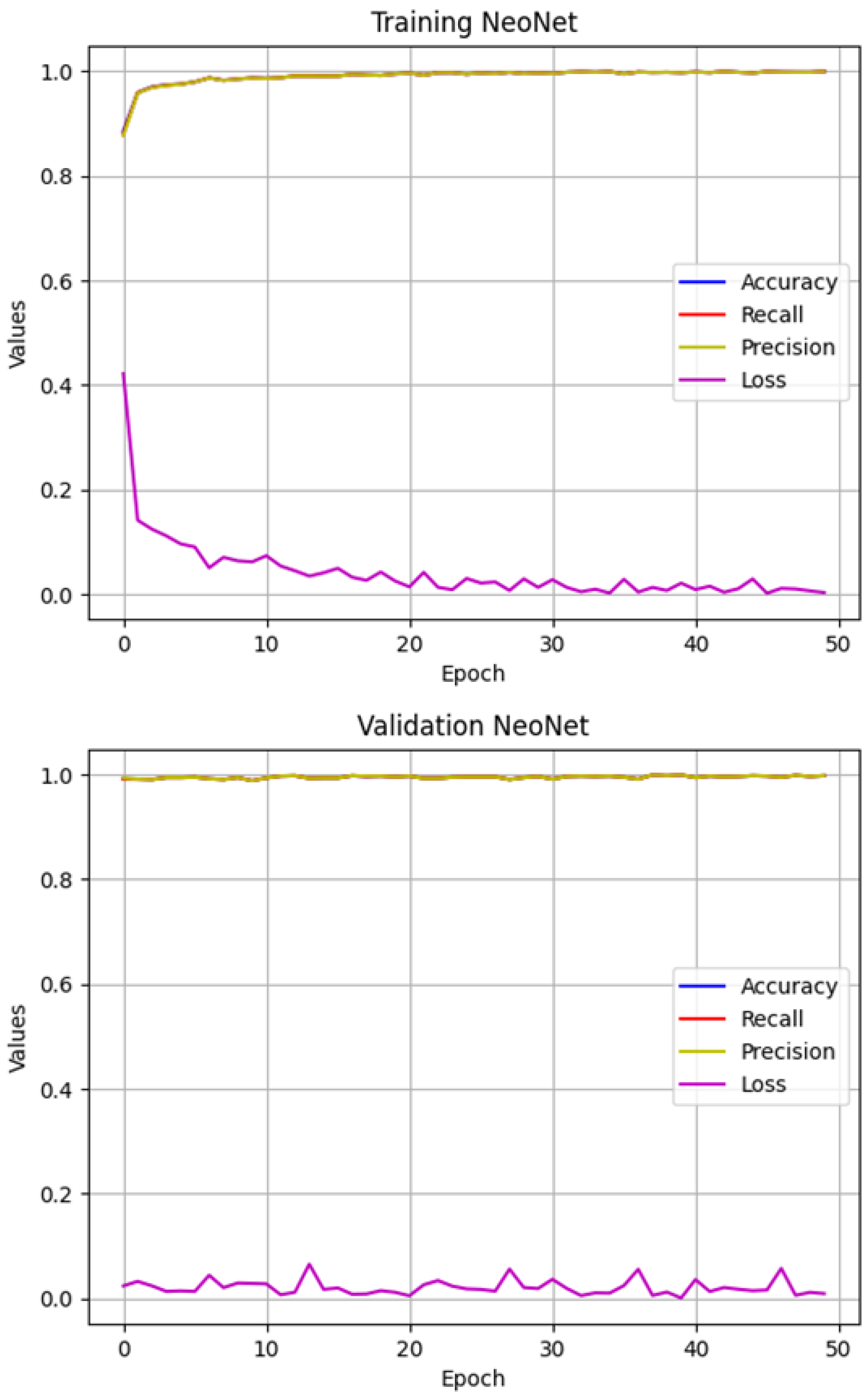 Figure 7 shows the training and validation curves of NeoNet, including accuracy, precision, recall, and loss. It can be observed that the accuracy, precision, and recall curves are almost completely overlapping in both training and validation.