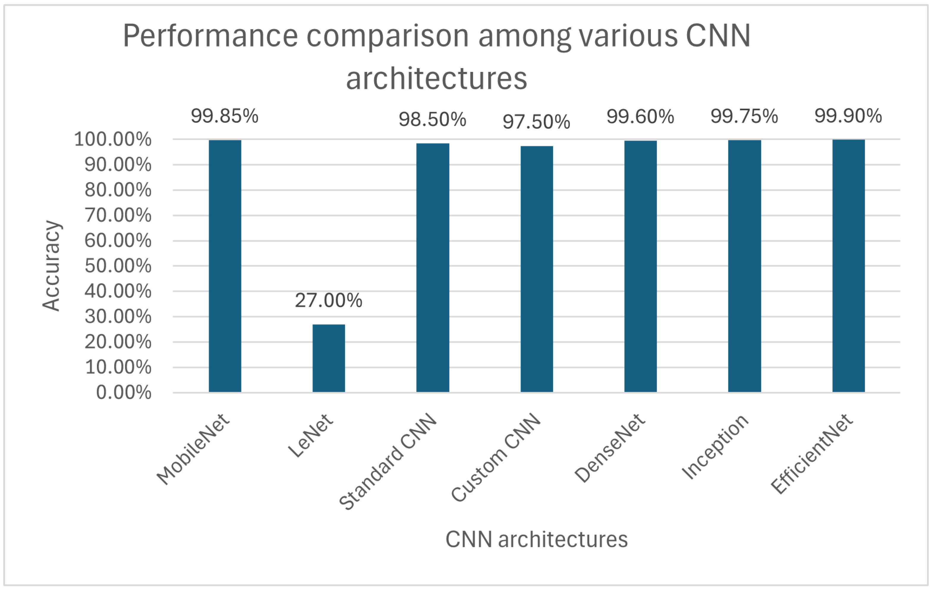 Figure 9, we have produced a comparative graph illustrating the accuracy of various CNN architectures, each evaluated under the same training conditions, specifically, a learning rate of 0.0001 and a batch size of 32. This comparison allows for a fair assessment to each model’s performance and provides insight into how different architectures respond to identical hyperparameter settings.