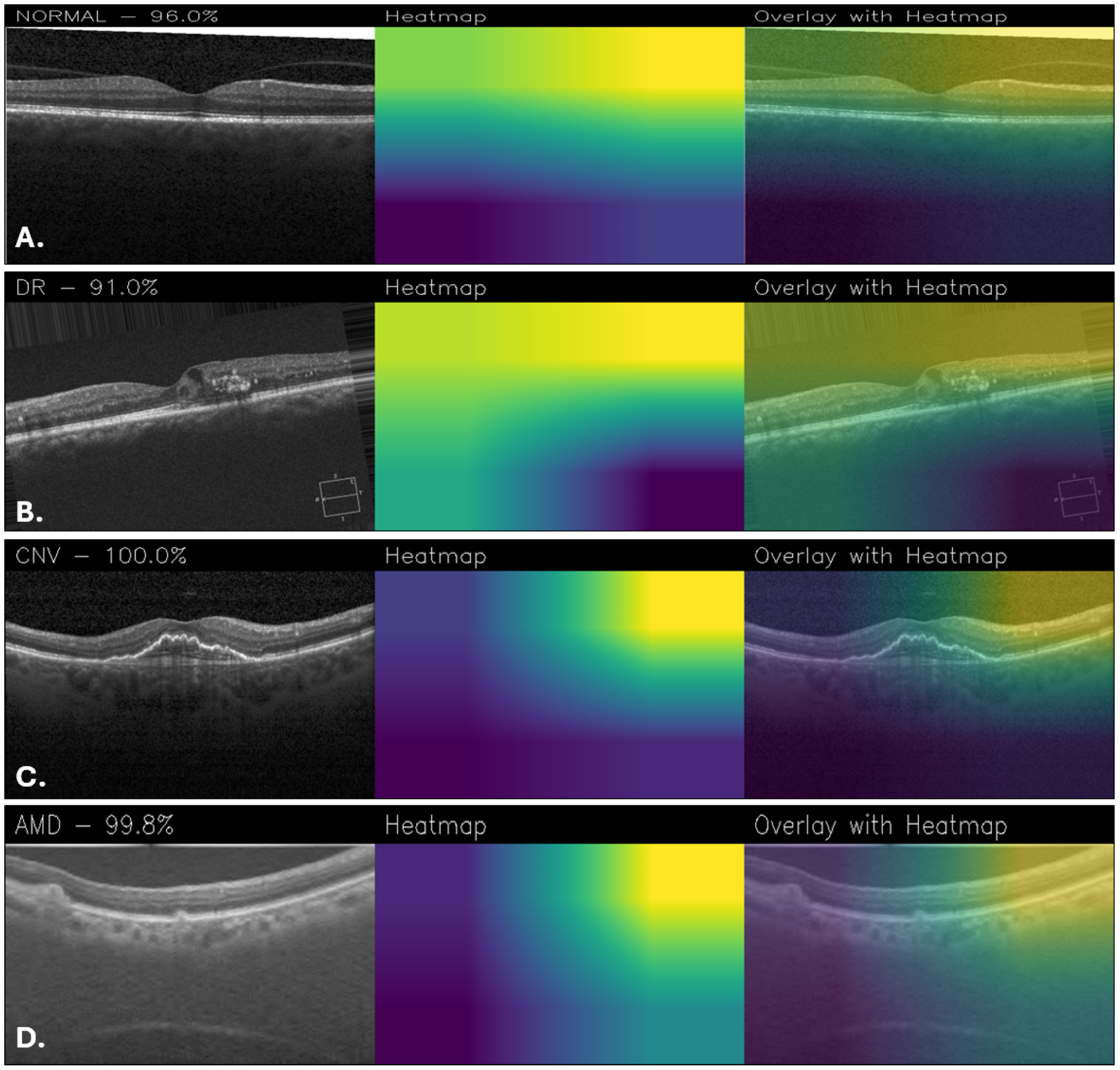 Figure 10 shows a series of classification examples made through the use of the NeoNet model. For each of the four retinal conditions (NORMAL, DR, CNV, and AMD), the following cases are shown: the original image (left), the heatmap of model activations (middle), and the overlay of the heatmap on the image (right). The highlighted regions indicate the areas that most influenced the classification.