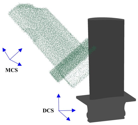 With the development of modern industrial manufacturing, 3D scanning technologies (e.g., structured light scanners and laser scanners) can accurately capture hundreds of thousands of data points from the part’s surface in just a few seconds [1]. In the maintenance, repair, and overhaul (MRO) industry, one of the primary applications of 3D scan data is computer-aided inspection (CAI) of aero-engine blades to check for their conformance to the specified tolerances over time [2]. Typically, deviations of in-service and damaged blades from their original geometric shape are evaluated through part-specific and section-specific inspection of the captured 3D point cloud [3,4]. In the case of damaged blades, repairing the material-missing regions—rather than replacing the entire component—can often be a more cost-effective solution to extend their service life [5,6]. Figure 1 shows the raw 3D scan data of a damaged blade as well as the CAD model. As illustrated in Figure 1, the scanned point cloud data is contaminated by measurement noise and outliers and lies in the measurement coordinate system (MCS), which has an arbitrary relative position and orientation with respect to the design coordinate system (DCS) in which the nominal CAD model lies. Figure 2 illustrates the outline of 3D scanning-based computer-aided inspection (CAI) and repair for damaged aero-engine blades in the presence of the nominal CAD model. The process begins with acquiring the raw point cloud of the damaged blade using 3D scanning, followed by point cloud processing to improve the data quality for the subsequent stages. The core of the framework focuses on constructing the damage-free geometric digital twin (gDT) of the 3D scanned defective blade and yielding the repair volume in material-missing regions. To construct the damage-free gDT, it is required to perform two main processes on data: scan-to-CAD rigid registration and CAD-to-scan non-rigid registration [4,7]. The scan-to-CAD rigid registration brings the scan data to a common coordinate system with the CAD model [8,9]. Then, the CAD-to-scan non-rigid registration is employed to gradually deform the CAD model dataset in deformed regions to match it with the measured data and generate the damage-free gDT of the damaged blade. Finally, the repair volume in material-missing areas is obtained through a Boolean operation between scan data and the damage-free gDT [7].