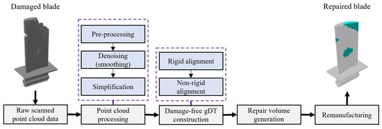 The motivation of this paper is to propose a point cloud processing approach in order to improve the accuracy and efficiency in 3D scanning-based computer-aided inspection and repair volume generation of damaged blades. As illustrated in Figure 2, the proposed methodology aims to denoise and simplify the raw scan data of a damaged blade (with material-missing regions and considerable deformations on the surface) to provide a clean and down-sampled dataset for scan-to-CAD rigid registration and CAD-to-scan non-rigid registration processes. This study develops a workflow that combines uncertainty-driven denoising, outlier removal, adaptive local fitting, and progressive down-sampling to improve rigid and nonrigid registration accuracy and efficiency for damaged blades to construct damage-free gDT. The point cloud processing approach includes three main steps: (1) pre-processing, (2) denoising, and (3) simplification. The main features of each step are outlined as follows: