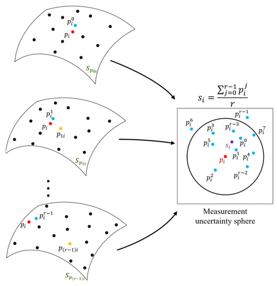 When we fit a plane or polynomial surface to the adaptive support domain of each measured data point using the weighted local least squares method, data points within the support domain are projected onto the fitted surface in the normal direction of the point . In order to guarantee the smoothness between projected data points of all locally fitted planes and polynomial surfaces, it is required to make the connection between locally fitted surfaces. To this end, we generate a map of projections for each measured data point . In this procedure, all locally fitted planes and polynomial surfaces containing the query point within their support domain are determined and the projected coordinates of the point are obtained. We suppose that each measured point could be included in the support domain of r measured data points. Thus, as can be seen in Figure 3, for each measured point , there are r projected coordinates . The projected coordinates are obtained via weighted local least squares approximation on the support domain of measured data points . As mentioned earlier, the actual point of each measured data point is somewhere within a sphere centered at the measured point with the radius equal to the expanded uncertainty 3u. Therefore, the projected data points are mapped into the uncertainty sphere centered at the point , as shown in Figure 3. In this study, for each measured data point , the filtered data point is defined as the mean value of projected coordinates at dataset :